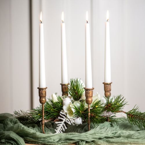 Verleihen Sie Ihrem Zuhause einen Hauch von Luxus und Gemütlichkeit mit unserem exquisiten Stabkerzenhalter in der Farbe Gold. Dieser antik gestaltete Kerzenhalter aus Metall bietet Platz für 4 Kerzen und ist die perfekte Ergänzung für eine festliche Tafel oder ein romantisches Abendessen.