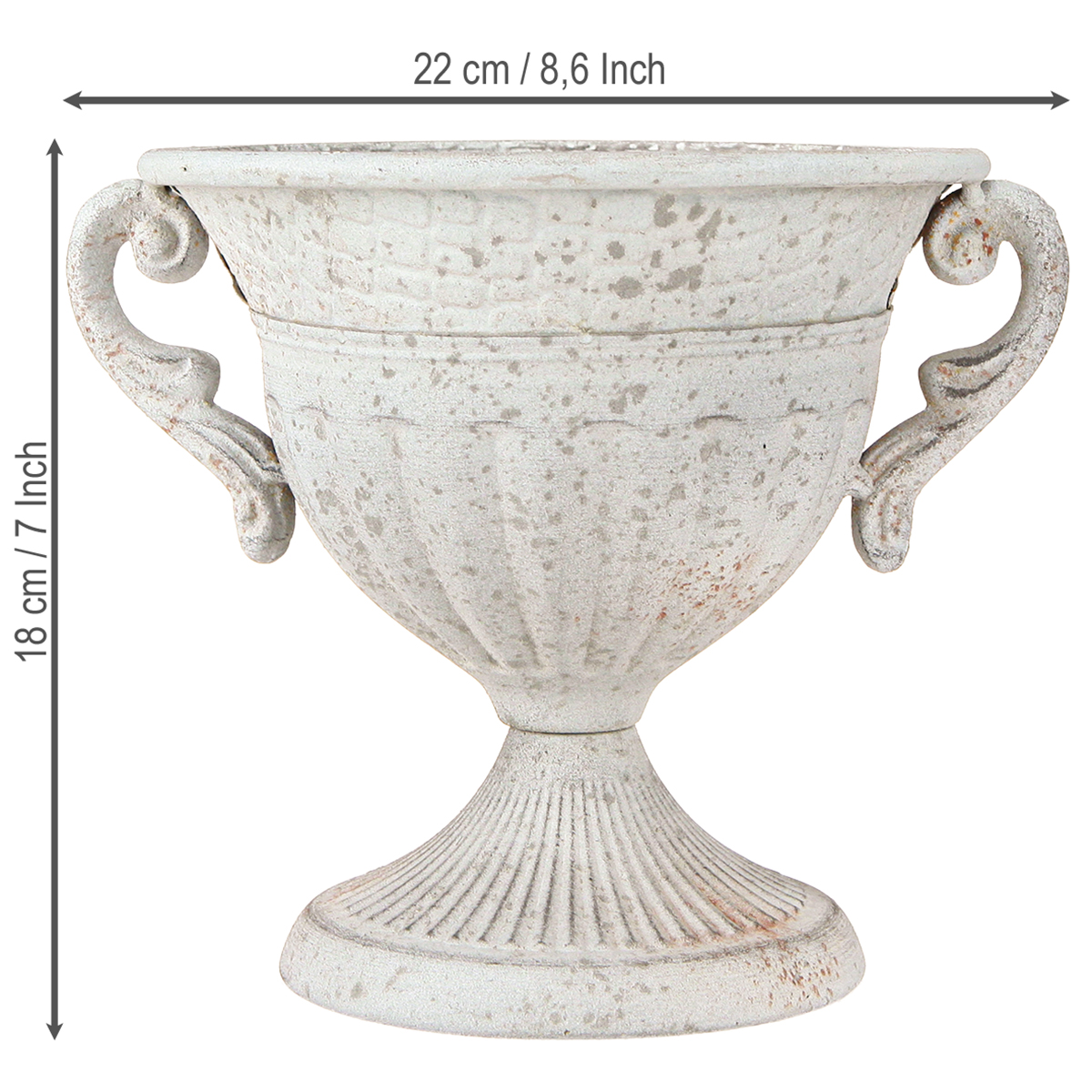 Der Antik-Pokal mit Henkeln als Metall-Deko im Vintage Look ist ein wahrer Schatz für alle Liebhaber von antiker Eleganz, Shabby Chic und Vintage-Dekoration. Mit seiner aufwändigen Vintage-Optik und den authentisch nachempfundenen Rost-Akzenten verleiht dieser Deko-Pokal jedem Raum unverwechselbaren Charme. Der nach antikem Vorbild gestaltete Kelch beeindruckt durch seine geprägten Muster und die kunstvoll verschnörkelten Henkel, die den klassischen Look abrunden. Der grau-weiße Farbton harmoniert wunderbar mit vielen Einrichtungsstilen, besonders dem beliebten Shabby- und Landhausstil, und bietet vielseitige Kombinationsmöglichkeiten mit anderen Wohnaccessoires. Ob als Highlight auf der Festtafel bei Hochzeiten und Events oder als rustikaler Akzent bei der Tischdeko in Landhäusern – dieser Pokal ist ein unverzichtbares Element für kreative Deko-Ideen mit antikem Charme.