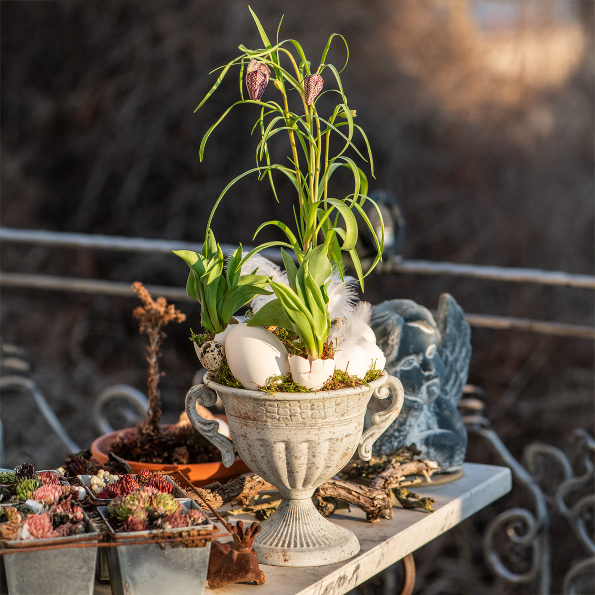 - Nutzen Sie den Pokal als stilvolles Gefäß für Trockenblumenarrangements zum Beispiel mit Blumen und Gräsern wie Limonium sinuatum oder Helichrysum bracteatum.