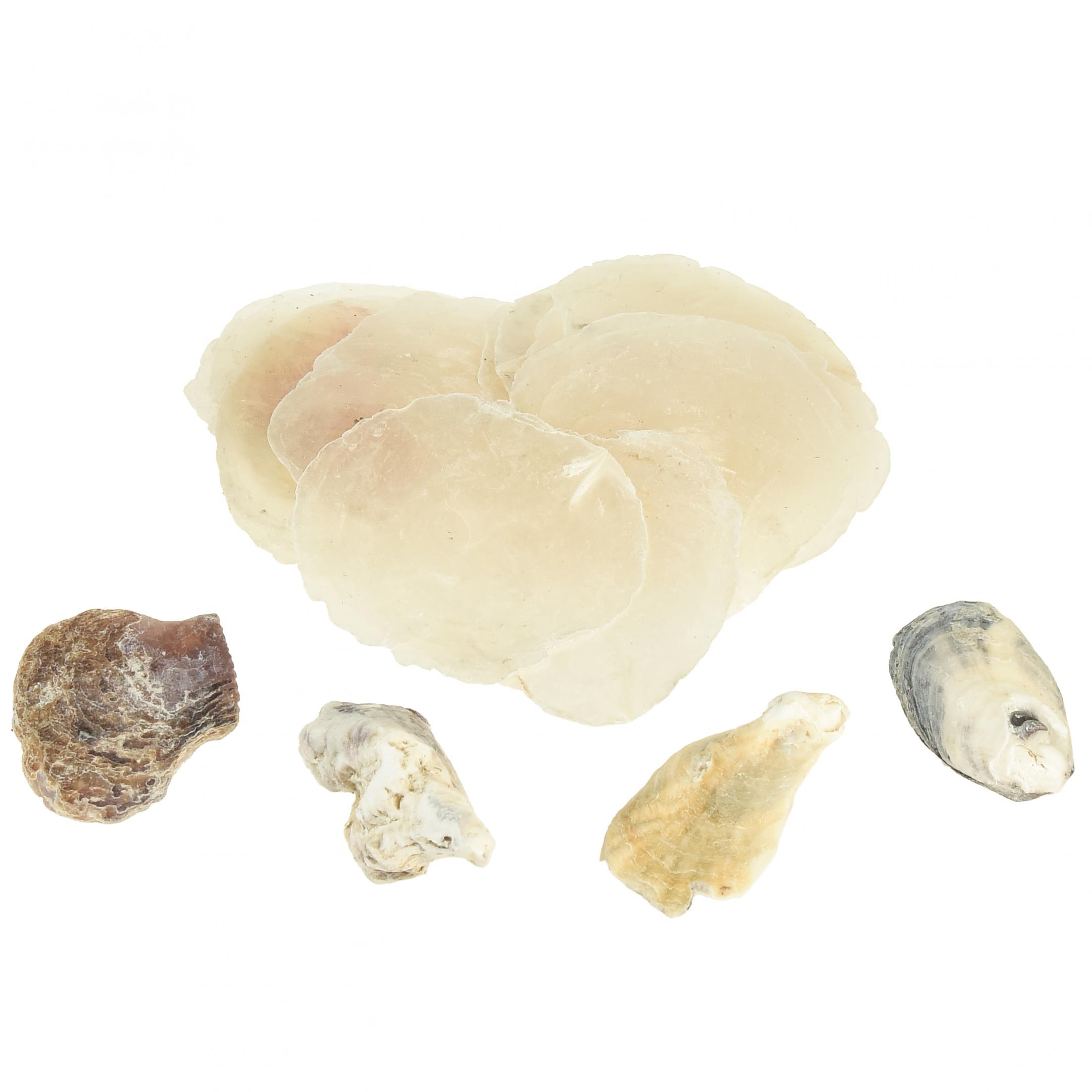 Sie erhalten die Capiz-Scheiben sowie Austern jeweils als Netz zu etwa 250 Gramm Nettogewicht. Im Netz sind viele einzelne Perlmutt-Muscheln mit einer Größe von 6,5 bis 9,5 Zentimetern und Austernschalen mit einer Länge von 3,5 – 9 Zentimetern enthalten.