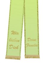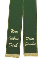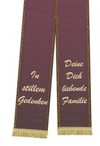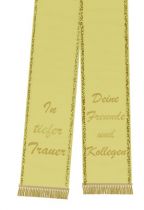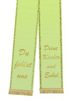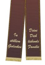 Darüber hinaus besitzen die Seidenbänder für die Trauerfeier einen vergoldeten Rand und am Ende goldene Fransen, die ihre hohe Qualität unterstreichen. Deswegen eignet sich jedes Band als würdevoller und angemessener Urnenschmuck beziehungsweise Grabschmuck für einen Sarg. Dabei sind die Trauersprüche aus verschiedenen Perspektiven formuliert und drücken Liebe, Trauer sowie Gedenken aus. Sie finden hier Kranzbänder für ein Familienmitglied, für die Großeltern oder auch für Arbeitskollegen.
