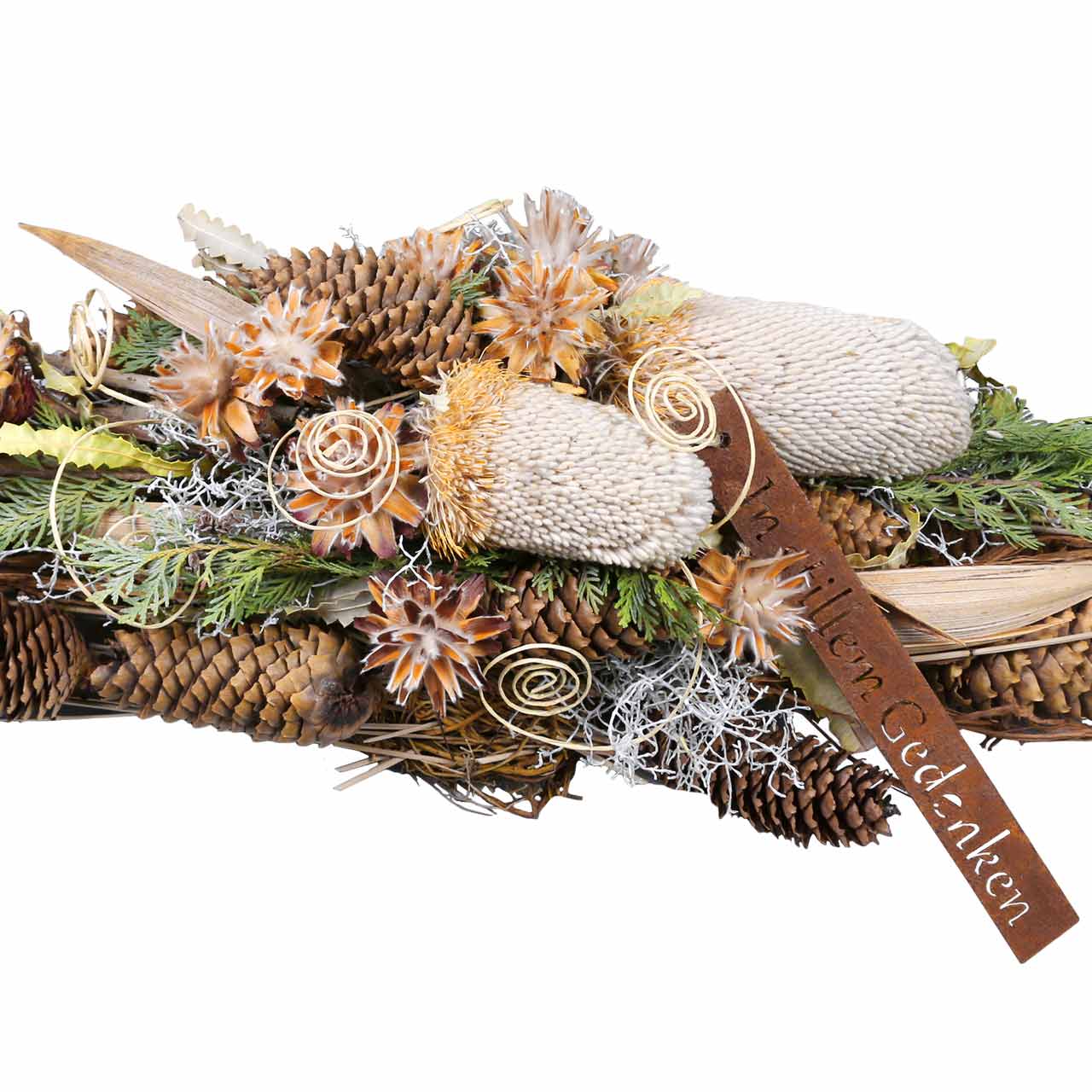 Die Banksia Hookerana, auch Hookers Banksie genannt, gehört zu den Banksien Gewächsen, die ausschließlich in Australien und Tasmanien vorkommen und mit ihrem einzigartig exotischen Aussehen begeistern. So auch diese Trockenblume in Natur, deren längliche Blüte sich aus unzähligen Einzelblüten zusammensetzt und von schmalen, gezackten Blättern umgeben ist. So entsteht eine extravagante Optik, welche die Banksia Hookerana zu einem floristischen Highlight macht. Sie ist beispielsweise eine wundervolle Ergänzung edler Grabgestecke und Trauerkränze für den Totensonntag oder Allerheiligen und harmoniert besonders schön mit weiteren Exoten und Naturartikeln in hellen und erdigen Farbtönen wie Bordeaux, Creme und Braun.