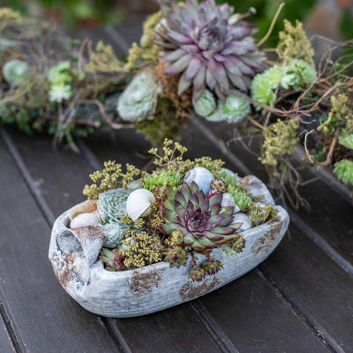 Deko-Bodendecker und Deko-Sukkulenten eignen sich zum Beispiel für die schmale, ovale Beton-Schale. Sie bieten ein harmonisches Gesamtbild für den urigen, antiken Look. Möchten Sie echte Pflanzen hineinsetzen, legen Sie die Deko-Schale zuvor mit Pflanzenfolie aus. So bleibt Ihnen die Betondeko lange erhalten. Für das Schonen Ihrer Möbel und Anrichten ist die Schale am Boden mit Kunststoff-Schonern versehen.