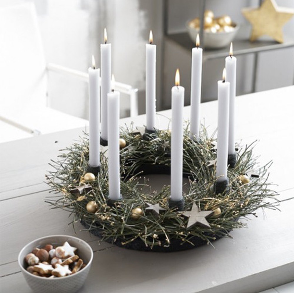 Bestücken Sie den Steckmoos-Ring für eine Trauerfeier mit Blüten und Seidenband. Oder Sie verwenden Trockenblumen, Exoten und Proteen für einen Grabschmuck am Totensonntag oder Allerheiligen. Vielleicht möchten Sie die elegante Farbe einmal ganz anders nutzen?! Bei Party-Kompositionen können Sie das edle Schwarz durchscheinen lassen. Somit ergibt sich nicht nur eine Material-, Zeit- und Kostenersparnis. Sie schaffen zusätzlich noch tolle Kontraste. Stellen Sie sich einmal vor, wie bei einem zarten, weißen und naturfarbenen Frühlingsgesteck das Schwarz des Untergrunds zu sehen ist. Dasselbe gilt auch für die Weihnachtszeit. Mit einer roten Kerze in der Mitte sorgt die Kombination aus Tannengrün, Holzsternen und edlem Schwarz für festliche Akzente in der Weihnachts-Deko.