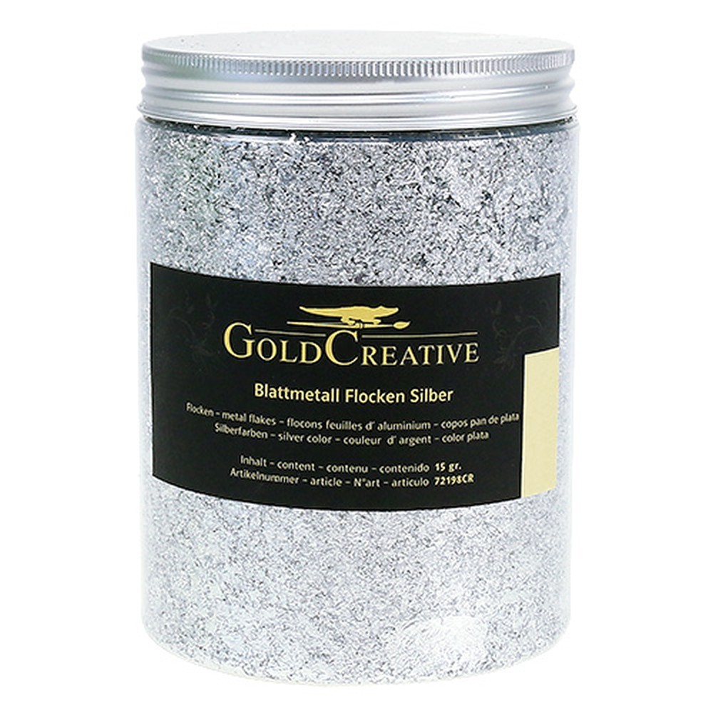Geliefert werden die silbernen Blattmetall Flocken aus Aluminium in einem wiederverschließbaren Kunststoffbecher. Das Gewicht beträgt ungefähr 15 Gramm, die Flocken sind jedoch sehr ergiebig und reichen für eine verhältnismäßig große Fläche.