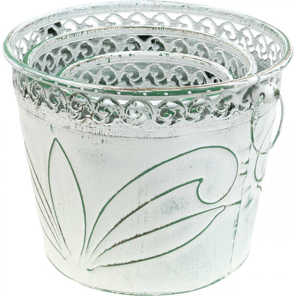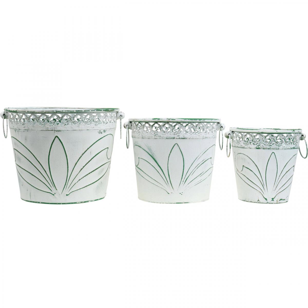 Produktname: Blech-Kübel mit Prägung, Pflanzgefäß mit Henkeln Weiß, Grün Shabby Chic H22/19,5/17,5cm Ø25,5/20,5/15,5cm 3er-Set