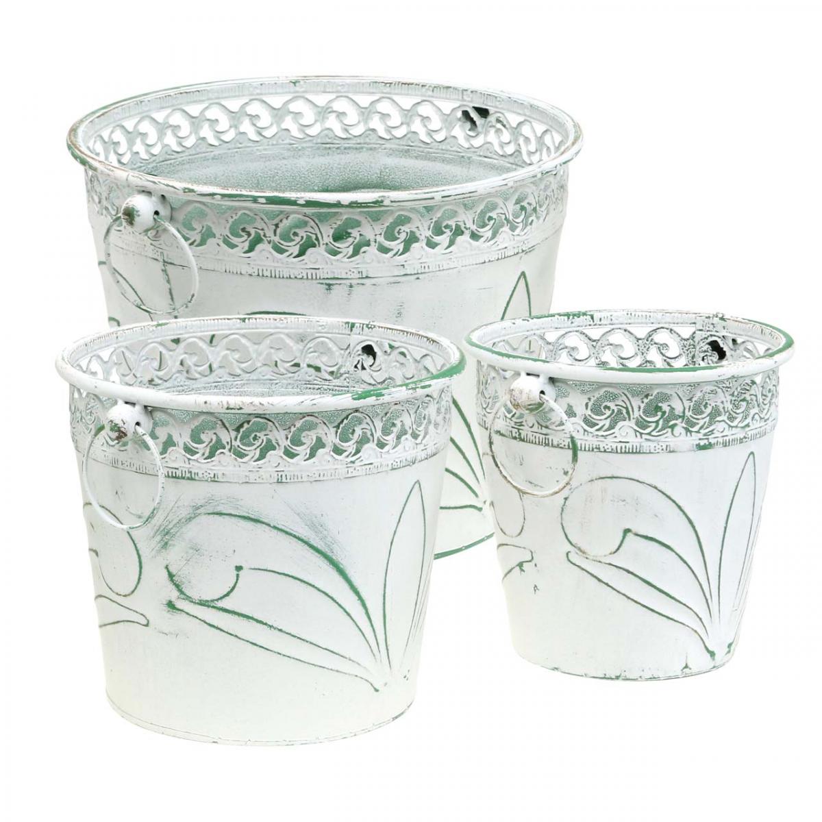 Blech-Kübel mit Prägung, Pflanzgefäß mit Henkeln Weiß, Grün Shabby Chic H22/19,5/17,5cm Ø25,5/20,5/15,5cm 3er-Set