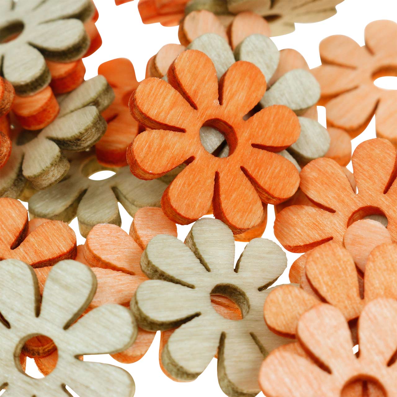 Sie erhalten die Blumen aus Holz als Streudeko in einer Kunststoffbox zu insgesamt etwa 144 Blumen geliefert. Die Blumen sind jeweils Apricot, Beige und Orange und besitzen einen Durchmesser von ungefähr 2 Zentimetern bei einer Stärke von etwa 2 Millimetern.