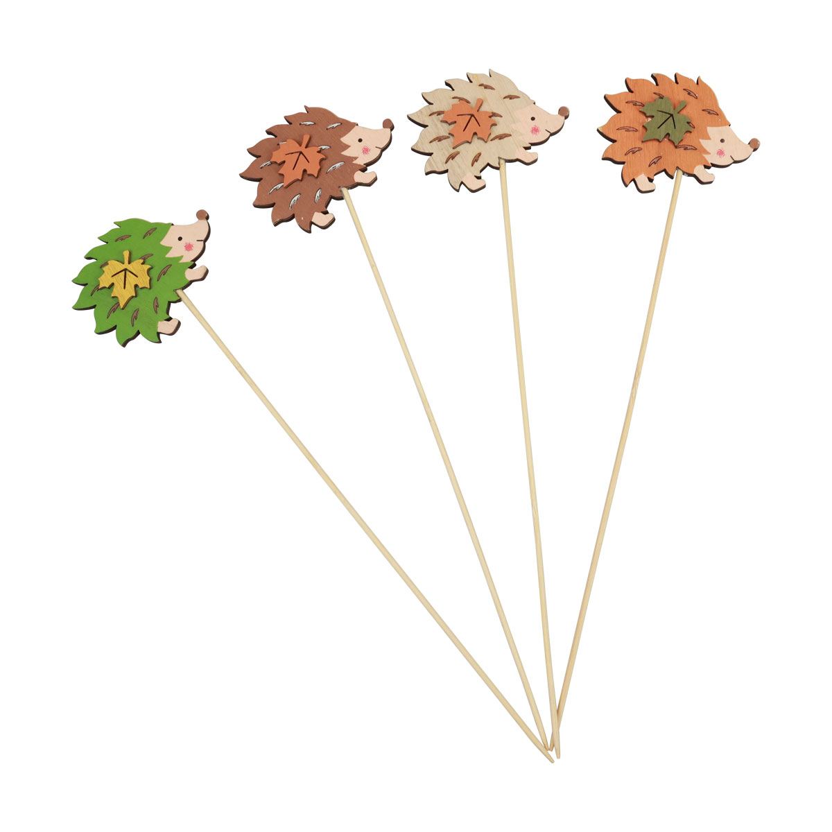 Zwölf kleine Igel in vier verschiedenen Farben krönen die Blumenstecker aus Holz. Auf jeder Igel-Deko ist ein Herbstblatt aufgesetzt, als wäre es gerade heruntergefallen und hätte sich auf dem Stachelkleid des Holzigels festgesetzt. Die Stacheln des Igels werden bei dieser Holzdeko mit dunklem Braunton angedeutet. Auch die Ränder der Dekofigur aus Holz zeigen die dunkelbraune Farbe.