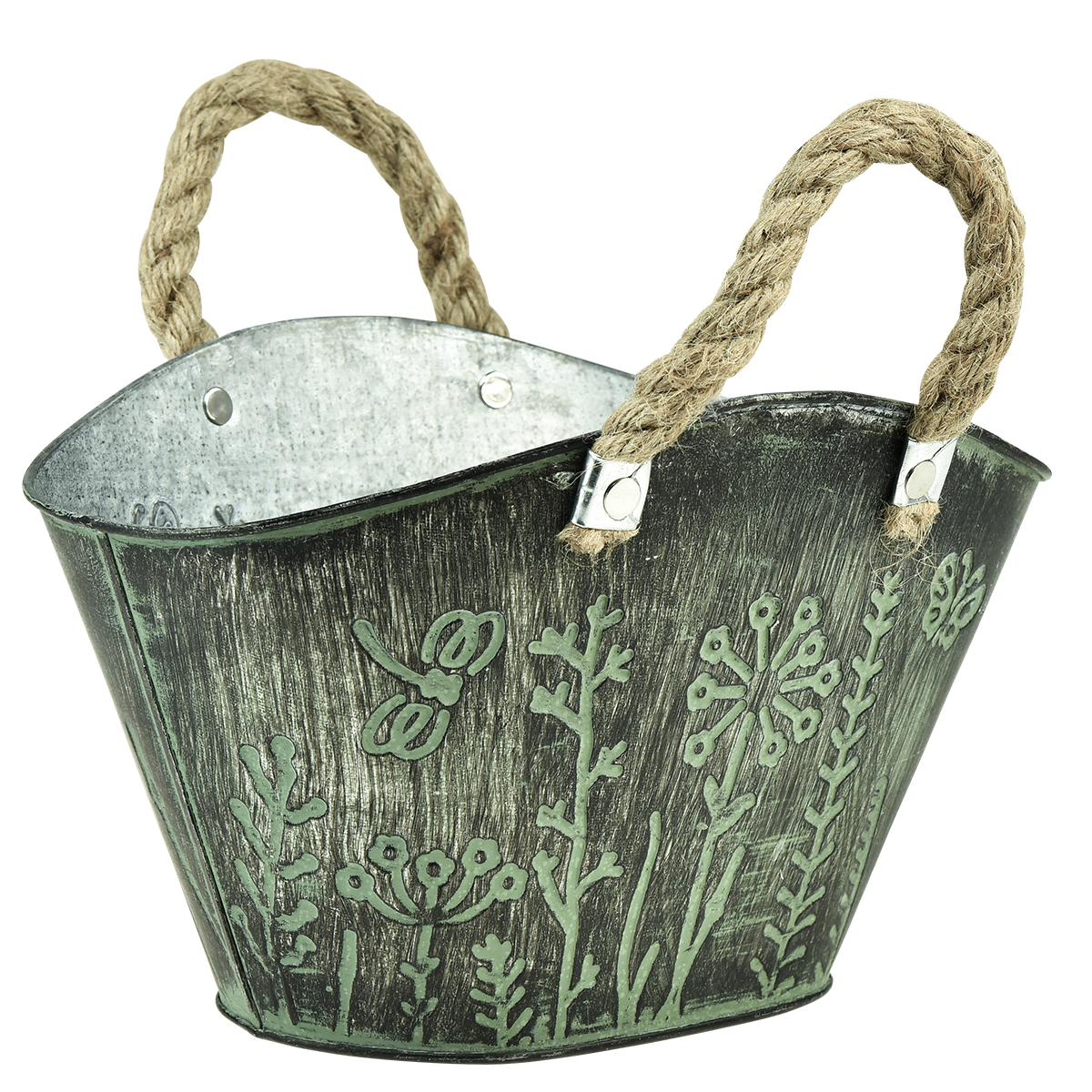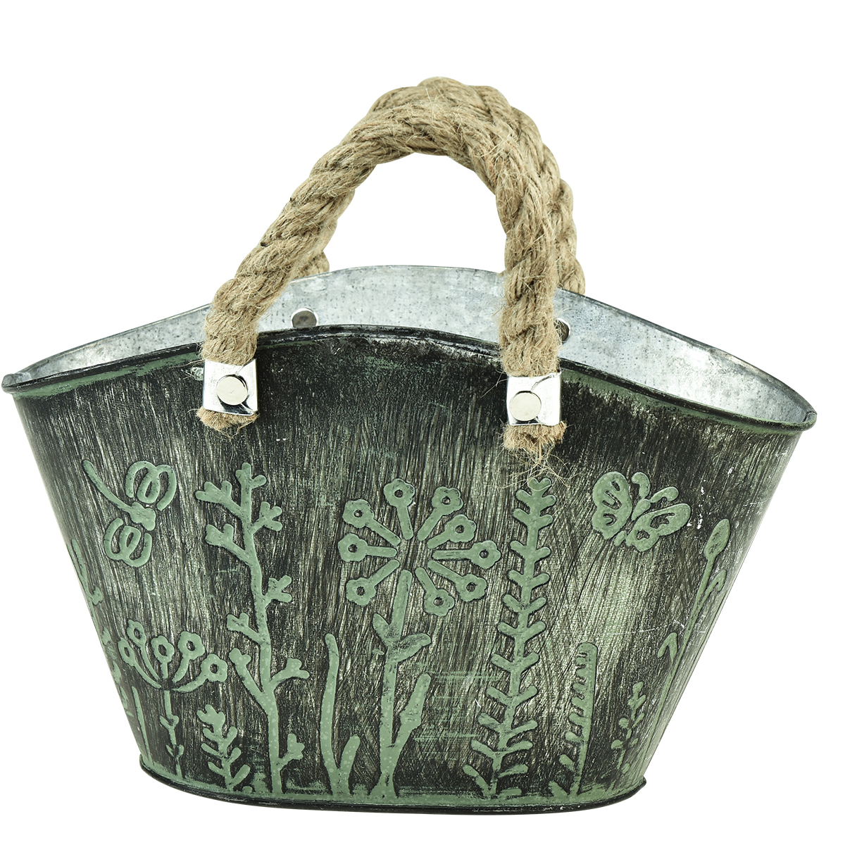 Der Übertopf hat die Form einer geflochtenen Einkaufstasche und wirkt so sehr entspannt. Auf der Außenseite ist der Metall-Topf in Grün und Dunkelgrau behandelt und das Erscheinungsbild prägt eine stilisierte wild wuchernde Blumenwiese. Die geflochtenen Henkel aus Naturfaser tun ein Übriges, um aus dem ovalen Blumentopf ein ganz besonderes Stück zu machen.