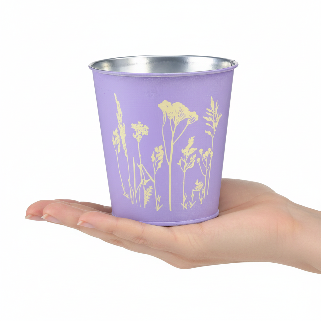Der Blumentopf aus Metall kommt in der Frühlingsfarbe Lila und mit einem schönen Blumen-Motiv, das an eine Wiese erinnert. Da möchte man den Übertopf doch gleich mit Frühblühern bepflanzen!