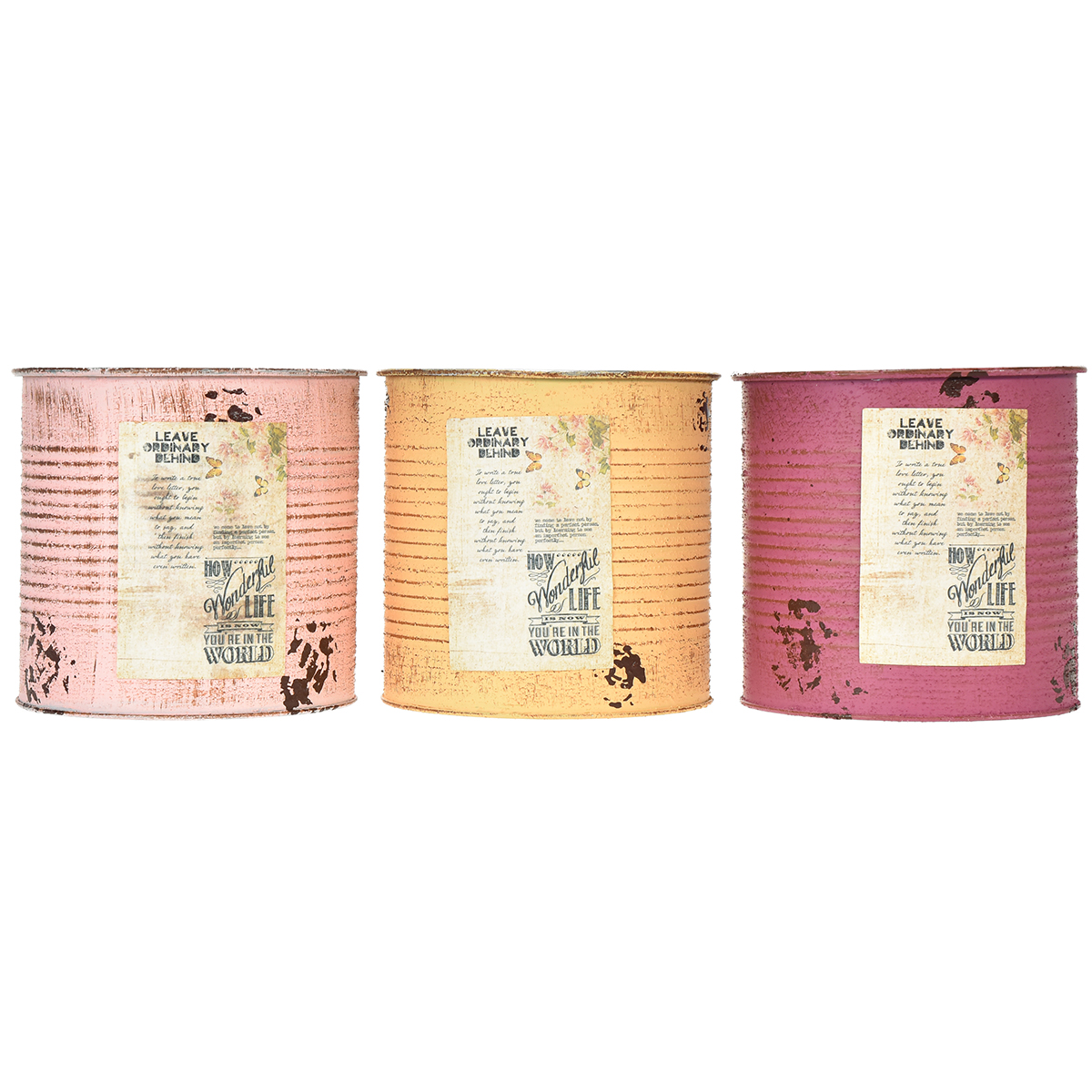 Mit diesem liebevoll gestalteten Blumentopf im Vintage-Look machen Sie jedes Dekorationsprojekt zu einem besonderen Highlight. Dank der Retro-Akzente und auf die Dosen aufgemalten Rostspuren schaffen diese außergewöhnlichen Pflanzgefäße eine gemütliche Atmosphäre – perfekt für den Landhausstil oder ein rustikales Ambiente. Die Kombinationsmöglichkeiten sind nahezu unbegrenzt – ob als dekorativer Übertopf für Zimmerpflanzen, mit Folie ausgekleidet als Pflanzdose, als DIY-Vase für Trockenblumen oder Organizer für Stifte und kleine Accessoires. Jede Dose ist 15 Zentimeter hoch und ein wahres Multitalent.