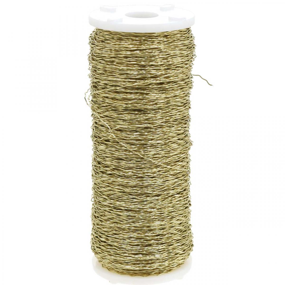 Der goldene Bouilloneffektdraht ist circa 140 Meter lang und hat einen Durchmesser von rund 0,30 Millimetern. Aufgewickelt auf eine praktische Kunststoffspule, ist der Kräuseldraht ein vielseitiges Accessoire, das in keiner Bastelwerkstatt fehlen sollte.