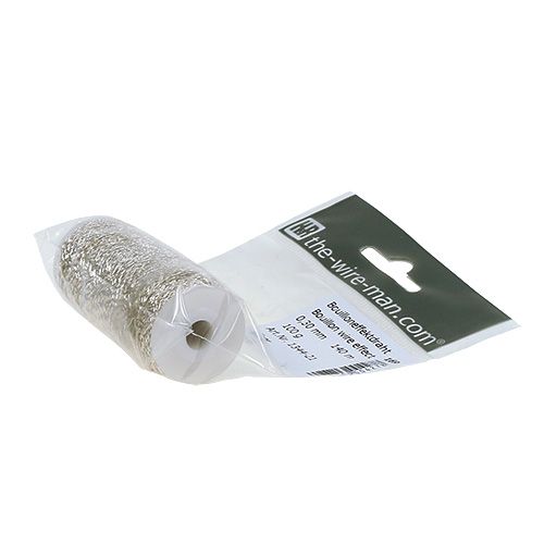 Der gewellte Bouilloneffektdraht in Silber hat einen Durchmesser von circa 0,30 Millimetern und ist mit seinen etwa 140 Metern in der Länge auf eine Kunststoffspule aufgewickelt. Diese besitzt noch eine durchgängige Öffnung in der Mitte, sodass Sie die Spule auch platzsparend in Ihrer Werkstatt aufhängen und den Draht bequem abrollen können. Insgesamt wiegt das Ganze ungefähr 100 Gramm.
