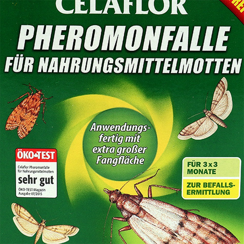 Wenn Sie wissen möchten, ob und wie stark Ihre Küche von Nahrungsmittelmotten heimgesucht wird, dann verwenden Sie die Pheromonfalle von CELAFLOR®! Die geruchlose und insektizidfreie Falle zur Befallsermittlung von Nahrungsmittelmotten, die sich im Trockenobst, Mehl, in Kakao- und Getreideprodukten entwickeln, lockt Mottenmännchen zuverlässig an.Diese werden durch die spezifischen Pheromone und optischen Reize der Falle angezogen und bleiben a Leim kleben. Die Anzahl der Tiere auf der Klebefalle gibt Auskunft über die Höhe des Befalls. Je mehr und je öfter Motten gefangen werden, desto wichtiger ist die Kontrolle Ihrer Lebensmittel auf Raupenbefall. Die Lockwirkungsdauer beträgt nach Abziehen der Schutzfolie circa 3 Monate. Eine Pheromonfalle CELAFLOR® reicht für den gesamten Küchen- bzw. Vorratsraum.
