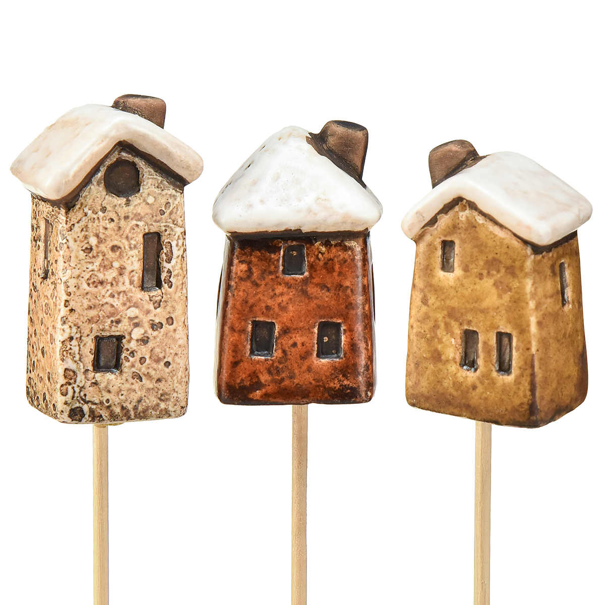 Charmantes Keramikhaus-Dekoration auf Stäben – Verschiedene Brauntöne, 6 cm – Idyllische Gartenstecker – 6St