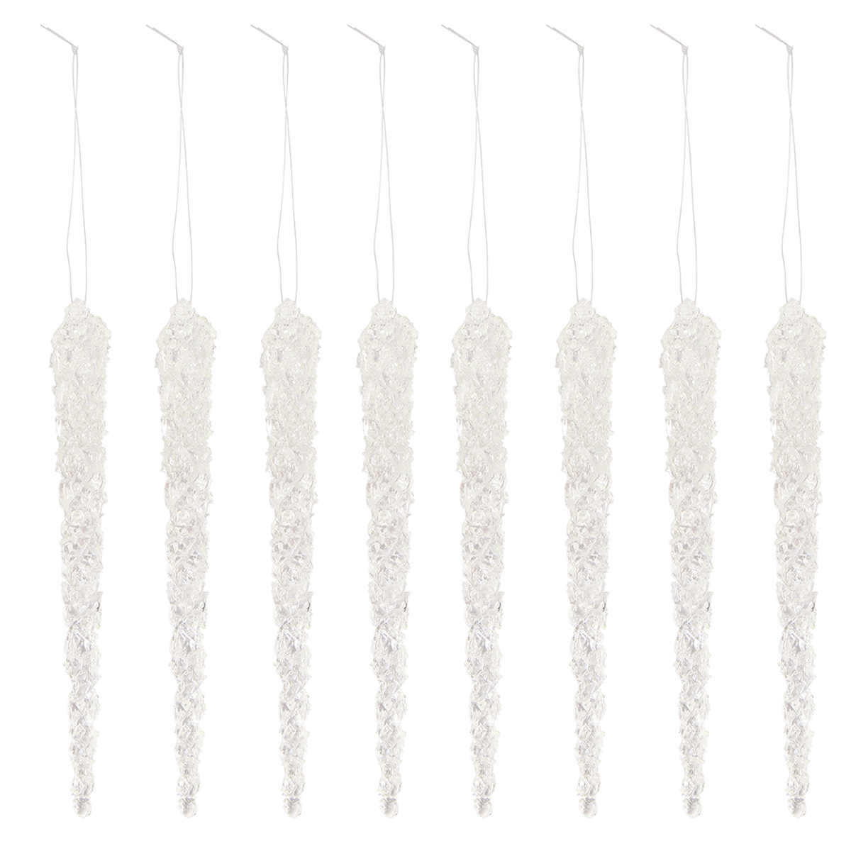 Der Christbaumschmuck bestehend aus künstlichen Eiszapfen wird in 2 Beuteln zu insgesamt 8 Stück geliefert. Mit dem Faden zum Hängen sind die Zapfen circa 22,5 Zentimeter lang, während sie selbst eine Größe von ungefähr 15 Zentimetern haben.