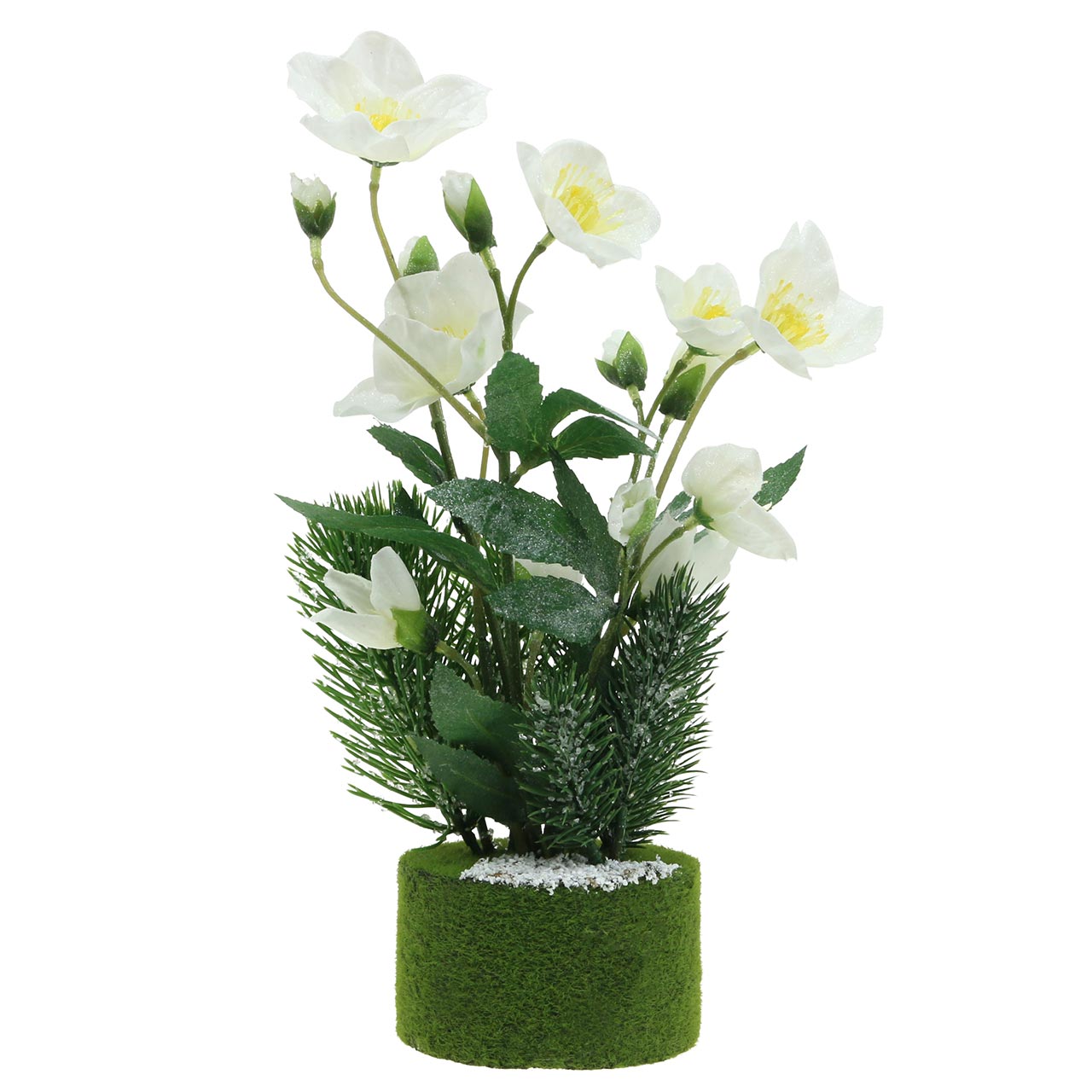 Christrose mit Tanne und Moosballen künstlich Weiß beschneit 33cm