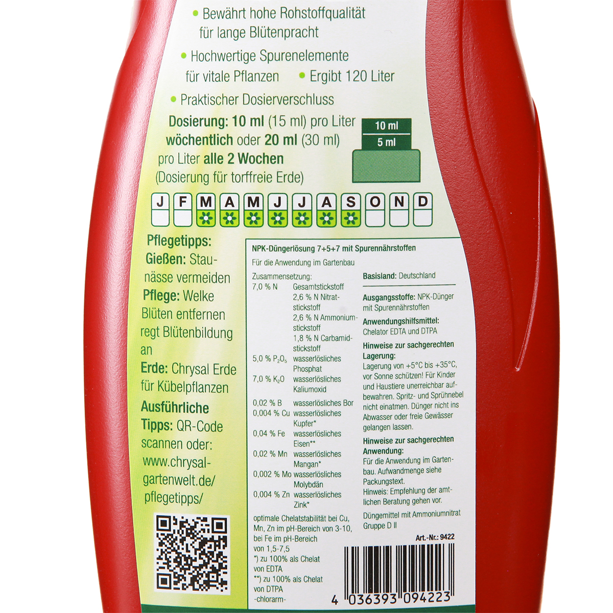 Der mitgelieferte Dosierverschluss macht das präzise Dosieren der Düngerlösung für das Gießwasser besonders einfach. Eine regelmäßige Düngung mit Chrysal Pflanzendünger sorgt für lang anhaltende Blütenpracht in Ihren Kübeln und Töpfen.