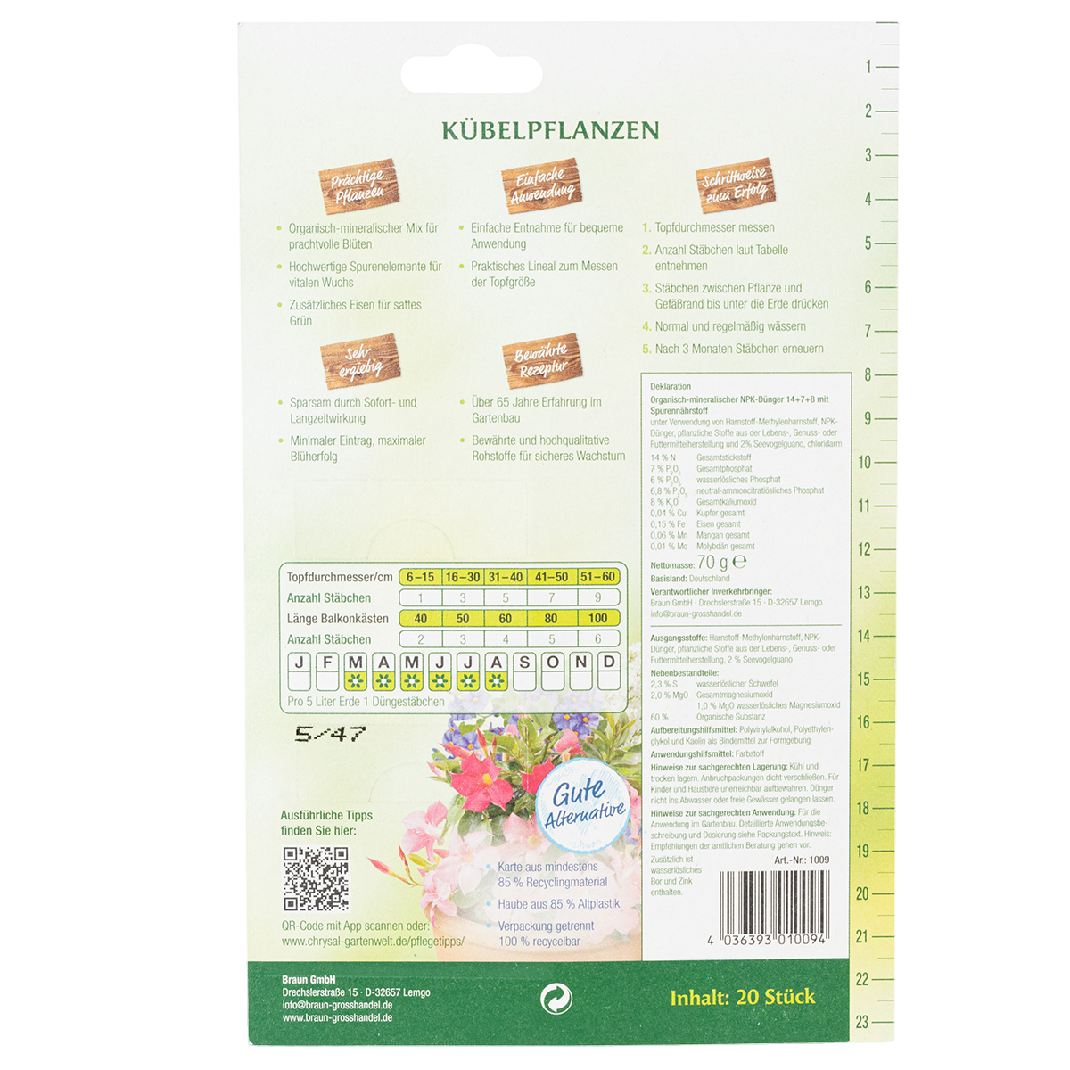 Ihre Kübelpflanzen verdienen die beste Pflege – und Chrysal-Düngestäbchen sind dafür die perfekte Wahl! Haben Sie sich jemals gefragt, wie Sie Ihre Balkon- und Zimmerpflanzen nachhaltig mit wichtigen Nährstoffen versorgen können, ohne ständig gießen oder düngen zu müssen? Diese praktischen Langzeitdünger sorgen für kräftiges Pflanzenwachstum und sattgrüne Blattfarbe, ganz ohne Aufwand. Die hochwertigen Düngestäbchen für Grünpflanzen sind ideal, um in Töpfen und Kübeln ein gesundes Pflanzenumfeld zu schaffen. Mit 20 clever portionierten Stäbchen haben Ihre Pflanzen bis zu drei Monate optimale Pflege.