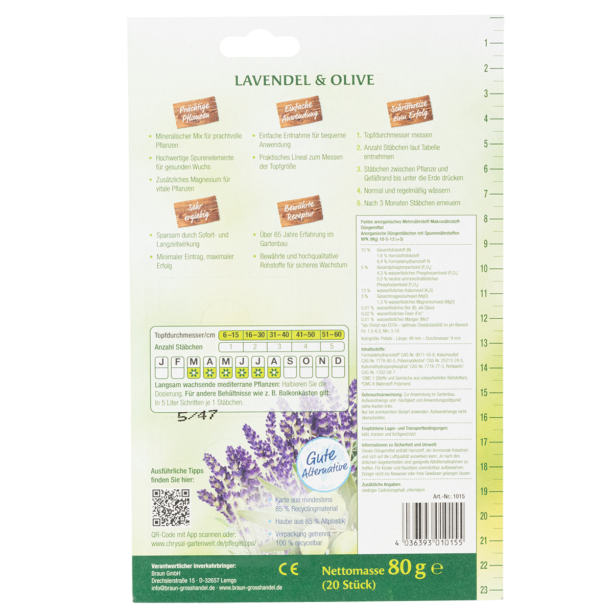 Hergestellt aus hochwertigen Nährstoffen, bieten sie eine gleichmäßige und langfristige Versorgung für bis zu drei Monate. Ob im Innenbereich oder geschützten Außenbereich, dieser Pflanzendünger entfaltet seine volle Wirkung und lässt Ihre Lavendel- und Olivenpflanzen aufblühen. Gönnen Sie Ihren Pflanzen das Beste und genießen Sie den Anblick gesund wachsender Pflanzen mit Chrysal!