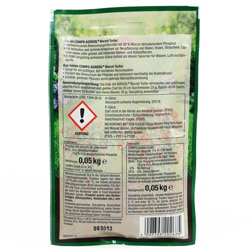 Der ideale Begleiter für Neubepflanzungen! Mit dem Agrosil® Wurzel-Turbo von Compo® lassen Sie Ihre Rosen, Sträucher, Bäume, Ihren Rasen sowie alle grünen und blühenden Balkon- Kübelpflanzen kräftig anwachsen. Durch das hochwirksame Phosphat werden die Wurzeln Ihrer Pflanzen stark stimuliert, sodass diese schnell, breitflächig und tief ausgebildet werden. Damit erhalten Ihre Pflanzen zügig einen kräftigen Stand und können sich effektiver Nährstoffe aus dem Boden ziehen.Zusätzlich enthält das Spezialgranulat für den Pflanzenwuchs noch sogenanntes Silikat-Kolloid, das ein idealer Speicher für Wasser, Luft und Nährstoffe ist. Damit der Spezialdünger auch seine volle Wirkung entfalten kann, vermischen Sie ihn mit der Erde beim Einpflanzen oder streuen Sie ihn auf die Oberfläche um die Pflanze herum und arbeiten das Bewurzelungshilfsmittel ein. In beiden Fällen sollten Sie die Erde danach ausgiebig wässern.