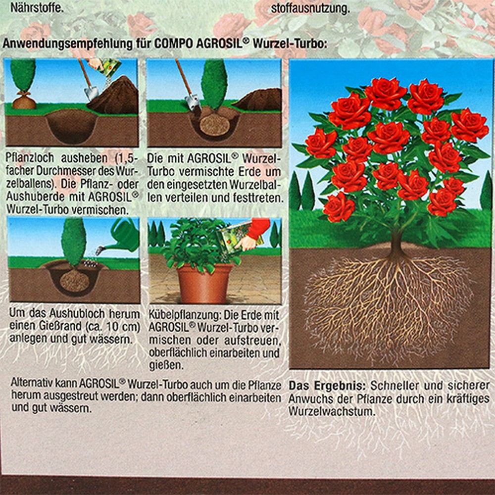 Frühlingszeit ist Pflanzzeit! Nutzen Sie AGROSIL® Wurzel-Turbo von COMPO® und sorgen Sie damit für ein schnelles und sicheres Anwachsen Ihrer neu gesetzten Pflanzen: Rasen, Rosen, Sträucher, Bäume sowie alle grünen und blühenden Kübel- und Balkonpflanzen. Mit diesem hochwirksamen Bewurzelungshilfsmittel von COMPO® mit 20 Prozent wurzelstimulierendem Phosphat schaffen Sie ein tiefreichendes, kräftiges Wurzelsystem und fördern so das Anwachsen Ihrer Pflanzen.