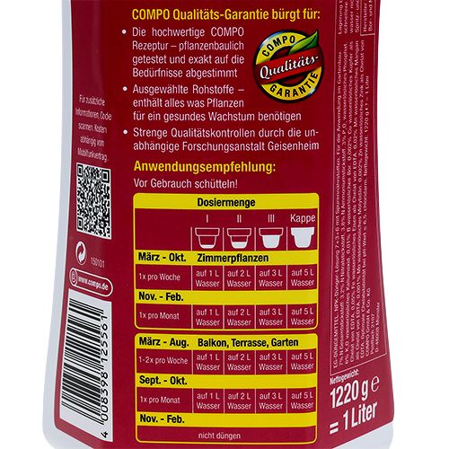 Damit Sie sich auch möglichst lange an den Blüten Ihrer Balkon-und Gartenpflanzen erfreuen können, sollten Sie diese regelmäßig düngen! Der professionelle Hortensie- und Kameliendünger von COMPO® in der 1 Liter Flasche besitzt eine ideale Nährstoff-Kombination mit allen wichtigen Haupt- und Spurennährstoffen für alle Moorbeetpflanzen wie beispielsweise Hortensien, Kamelien, Azaleen und Rhododendren.Der Blumendünger wirkt sofort, stimuliert das Wurzelwachstum und stärkt die Widerstandskraft. Durch den Zusatz von Eisen wird die Blüten- und Blattfarbe Ihrer Zierpflanzen noch intensiver. Richtig praktisch ist auch der Deckel, der eine saubere und bedarfsgerechte Dosierung des Flüssigdüngers ermöglicht!