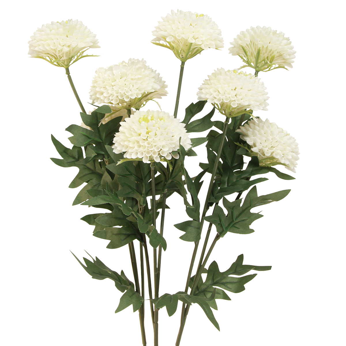 Erleben Sie die makellose Schönheit und Vielseitigkeit unserer weißen Deko-Blumen. Diese künstlichen Dahlien überzeugen mit ihrer detailgetreuen Nachbildung der Natur: Jede der zahlreichen kleinen röhrenförmigen Einzelblüten bildet zusammen eine prachtvolle weiße Blüte und sorgt für ein authentisches Flair in Ihrem Zuhause. Das Bund enthält drei Stiele, die jeweils dreifach verzweigt sind. Jeder Stiel trägt drei Blüten und sechs Blätter, deren Oberfläche aus feinem Gewebe besteht und die hochwertige Verarbeitung dieses Dekorationselements unterstreicht.