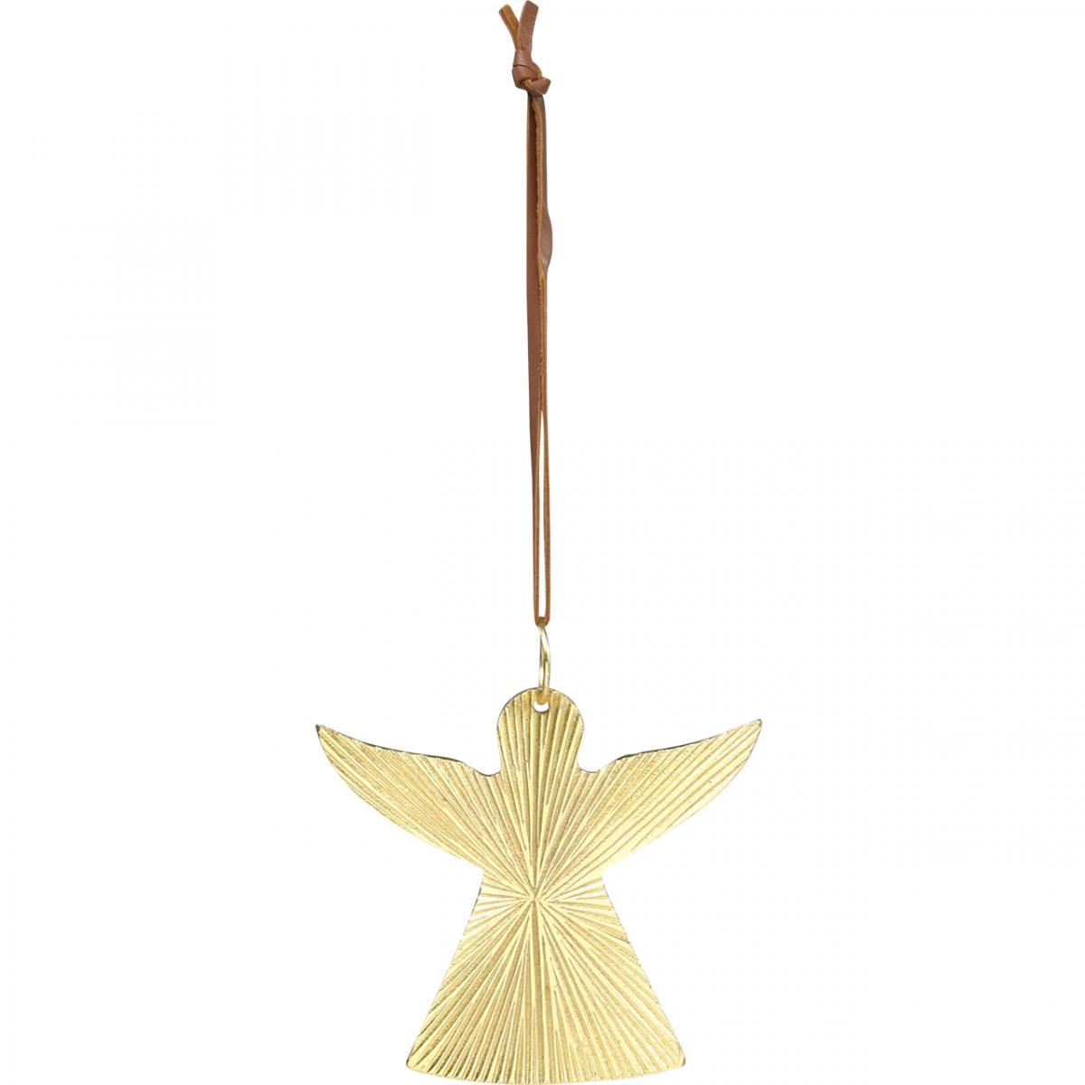 Die Engel zum Hängen sind eine Metalldeko die beidseitig mit einer strahlenförmigen Gravur verziert sind. Von der Mitte der Goldengel aus führen die geraden Linien der Prägung bis an die Außenseiten hinaus und reflektieren auftreffendes Licht aus Lichterketten oder Kerzenlicht ganz wunderbar. An der Oberseite ist jeder Engel aus Metall mit einem schmalen Lederband versehen, womit der Dekoanhänger bequem als Christbaumschmuck oder Fensterdeko aufgehängt werden kann.