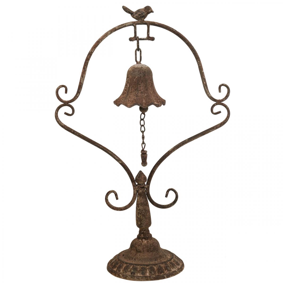 Die Glocke hängt an einem kunstvoll angefertigten Metallrahmen, der auf einem massiven Standfuß steht. Ganz oben auf der antik wirkenden Metalldeko thront ein kleine bezaubernde Vogelfigur.