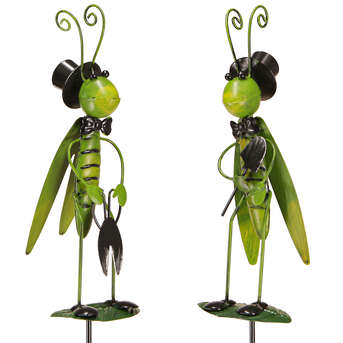Mit unseren Deko-Grashüpfer am Stab als Gartendeko aus Metall setzen Sie genau die richtigen Akzente in Ihrem Gartenparadies. Diese stilvollen Metall-Tierfiguren haben nicht nur Charme, sondern auch eine humorvolle Note, die jedem Betrachter ein Lächeln auf die Lippen zaubert. Beide Grashüpfer tragen Zylinder und Fliege. Doch während eine Figur eine Gartenschere hält, trägt die zweite eine Schaufel. In klassischem Grün und Schwarz bemalt, fügen sich diese Figuren harmonisch in jegliche Gartenlandschaft ein. Sie erwecken mit ihrem originellen Design und den liebevoll gestalteten Details eine lebhafte Atmosphäre, sei es auf Ihrer Terrasse, in Blumenkübeln oder entlang von Gartenwegen. Unsere Grashüpfer als Deko am Stab sind perfekt für jeden, der seinen Garten mit einem Hauch von Laune und Individualität verschönern möchte.