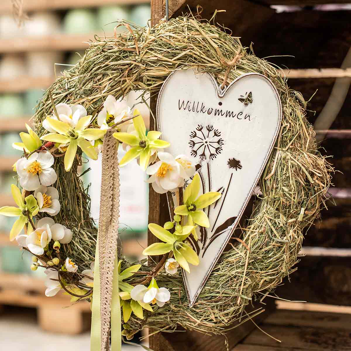 Das Herz mit der Pusteblume ist ab der Frühlingsdeko genau das richtige Accessoire für einen Türkranz im Landhausstil. Doch auch Shabby Chic oder Boho lassen sich mit dem Metallherz stimmungsvoll ergänzen. Ob Trockenblumen oder Seidenblumen, die Dekoherzen zum Hängen ergänzen Sommerdeko als Hänger für die Türdeko oder Fensterdeko gleichermaßen. Aber sogar ganz ohne Kranz können die nostalgischen weißen Deko-Herzen aus Metall eine Tür einladend gestalten.