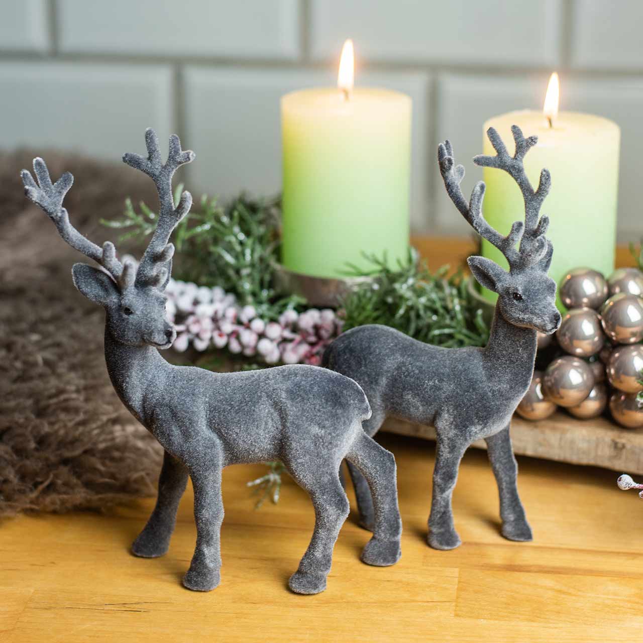 Sie bekommen zwei der grau beflockten Hirsche im sortierten Set: Die beiden Rentiere unterscheiden sich in Haltung, Geweih und sogar im Gesichtsausdruck! Die Dekofigur ist bei einer Länge von ungefähr 15 Zentimetern in etwa 20 Zentimeter hoch.