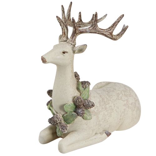 Verleihen Sie Ihrer Weihnachtsdeko einen Hauch von Vintage-Charme mit unserem liegenden Deko-Hirsch. Das prächtige Geweih und die sorgfältig ausgewählten Farbtöne in Blassgrün und Braun machen diese Dekofigur zum perfekten Hingucker für die Festtage.
