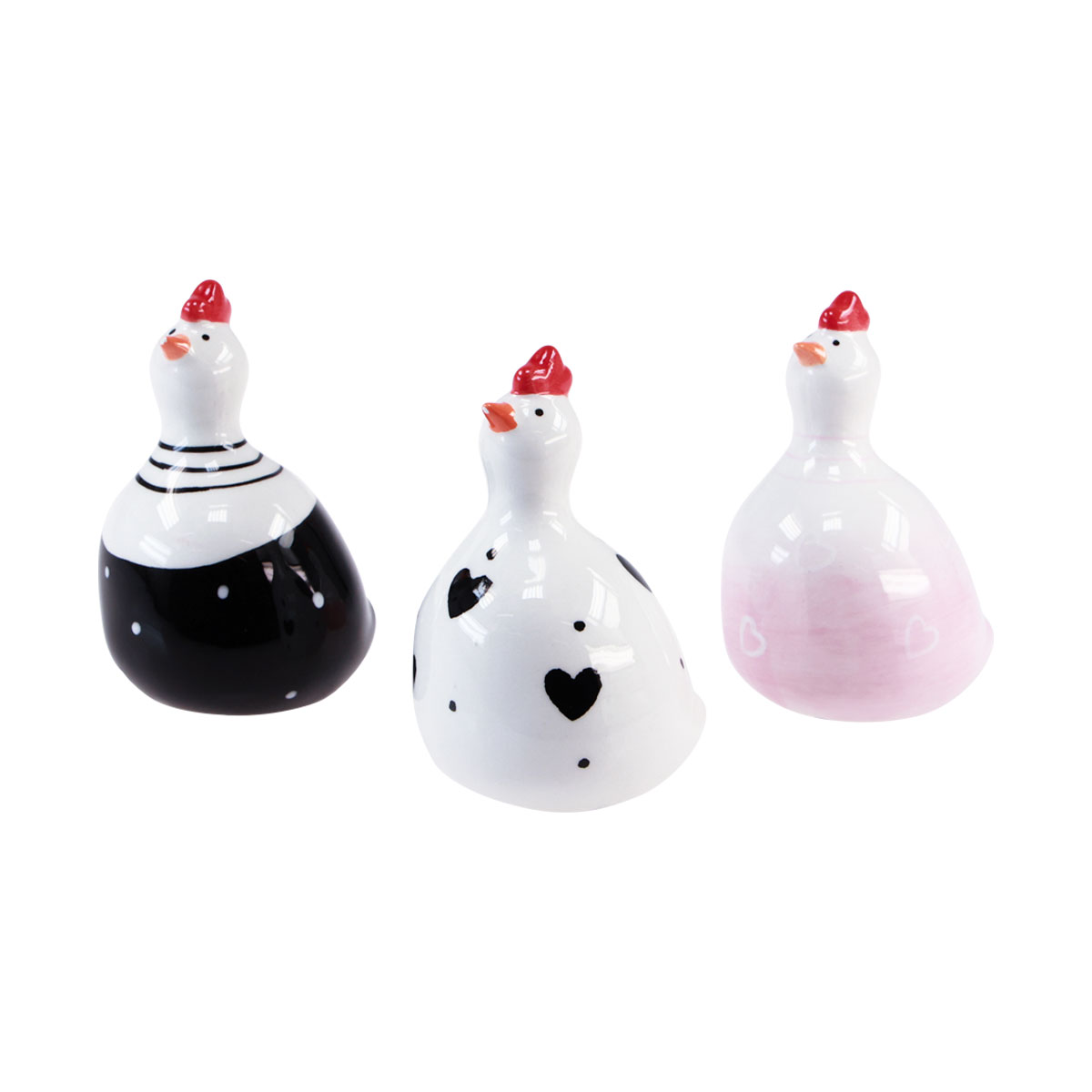So hat je ein Deko-Huhn einen schwarzen Bauch mit weißem Punktmuster sowie ein schwarzes Ringelmuster um den Hals, ein weiteres mit zart Rosa Bauch ein weißes Herzchenmuster und rosa Ringe um den Hals und das dritte im Bunde ist ganz in Weiß und mit einem Muster aus großen Herzen und kleinen Pünktchen in Schwarz versehen.