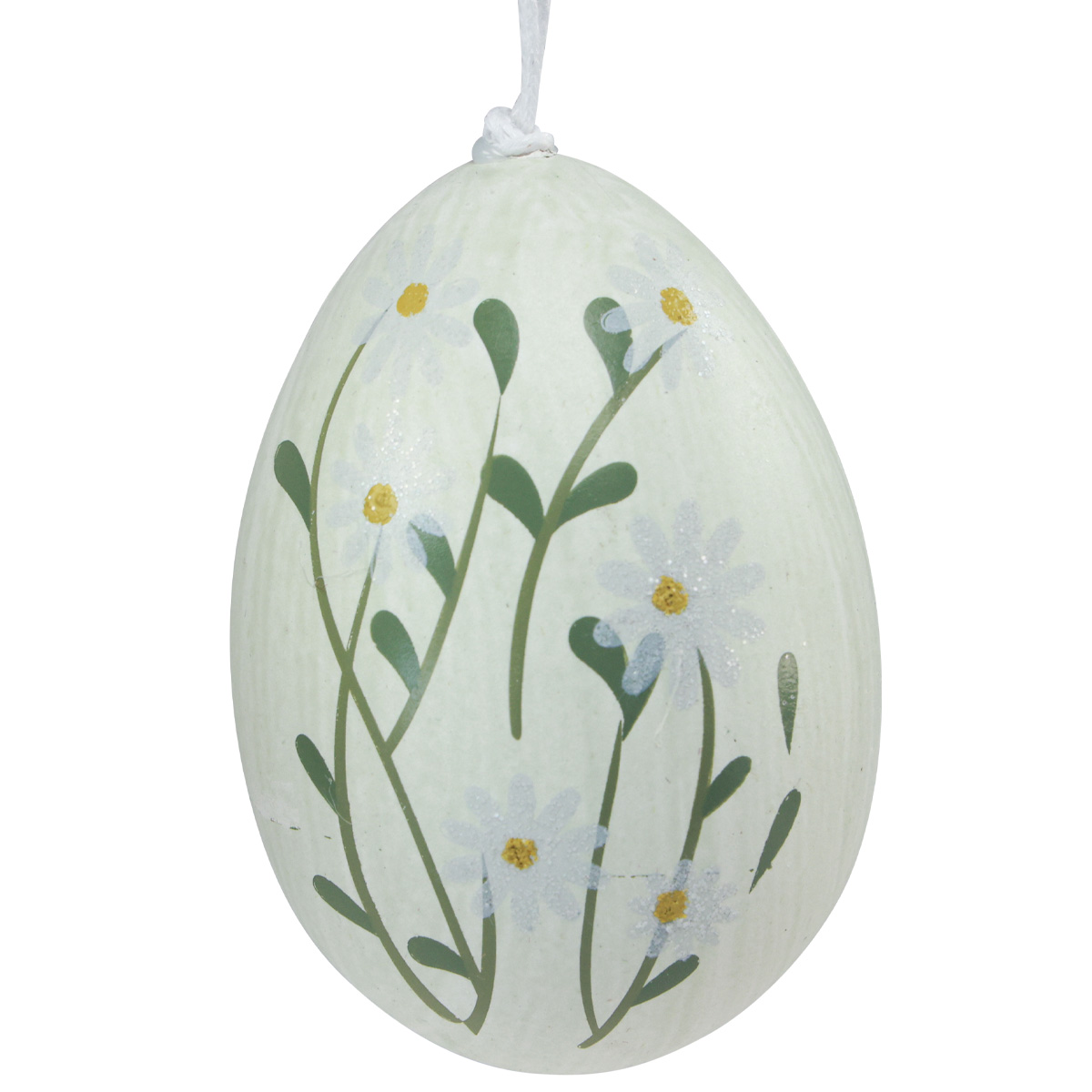 Die Ostereier sind in drei Farben marmoriert und zur Dekoration einseitig mit verschiedenen Blumen bemalt. So erhalten Sie ein cremeweißes Dekoei mit Gänseblümchen, ein senfgelbes mit Blüten in Weiß, sowie eines in Grün mit weißen Margeriten.