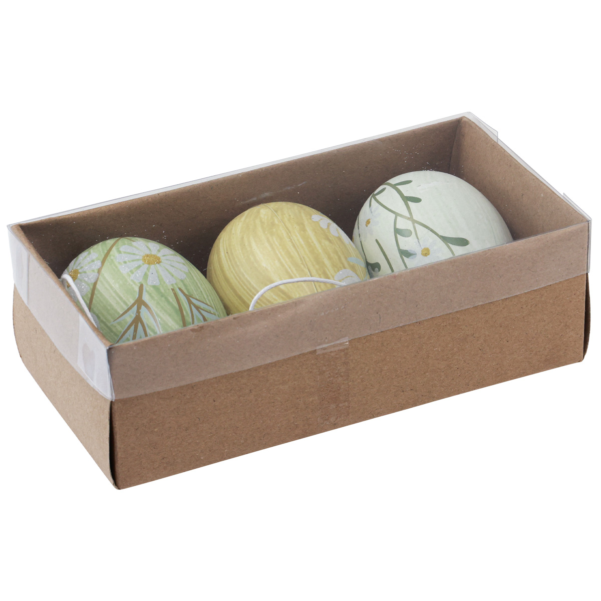 Die Ostereier sind etwa 7 Zentimeter groß und kommen farblich sortiert zu 3 Stück in einer Schachtel mit transparentem Deckel.
