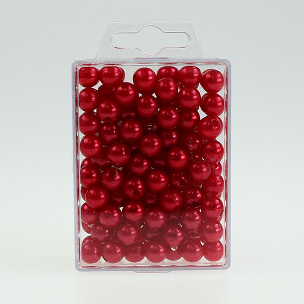Jede Deko-Perle in Rot misst im Durchmesser rund 10 Millimeter. Der Durchmesser der Löcher beträgt etwa 3 Millimeter.