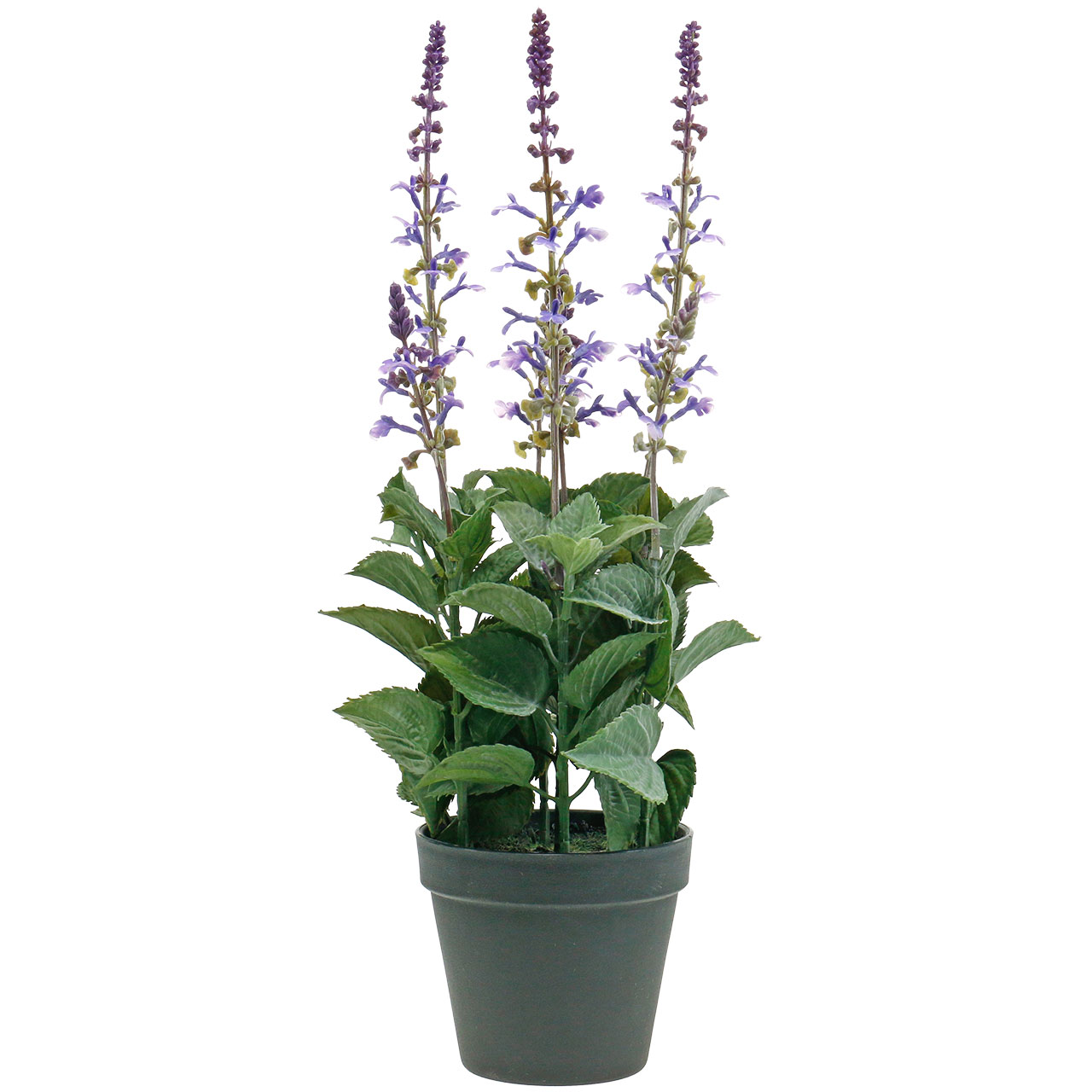 Der künstliche Lavendelbusch im Blumentopf der Qualitätsmarke VIANA ist aus hochwertigem Kunststoff gefertigt und wurde sehr naturgetreu gestaltet: Die Stiele sind unten Grün und wechseln oben ins bräunliche. Unten sind die Lavendelzweige mit vielen unterschiedlich großen Lavendelblättern in Grün mit typisch gezacktem Rand bestückt. Auf der Oberseite weisen die Grünblätter eine zarte Grauweiße Schicht auf, die den Blättern einen matte Optik verschafft. An den Spitzen endet jeder der Zweige jeweils in einen der typischen ährigen Blütenstände in Violett. Die kleinen Blüten des Lippenblütlers sehen dabei täuschend echt aus. Die Erdoberfläche im Blumentopf ist unregelmäßig mit grünen Fasern überzogen, was sie bemoost wirken lässt. Insgesamt ragen sieben unterschiedlich hohe Zweige aus dem Dekotopf.