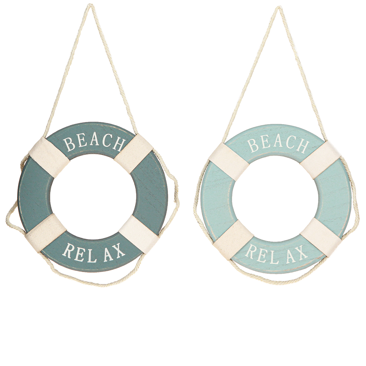 Der kleine Schwimmreifen ist in seiner typischen Optik in drei Abschnitte aufgeteilt, wovon der eine in Hellblau und der andere nin Dunkelblau gestaltet ist. Auf den weißen Flächen des Rettungsrings steht jeweils “Relax” und “Beach”. Die Deko-Rettungsringe sind mit Baumwollband abgeteilt. Ein längeres Baumwollband, welches rings um den Schwimmring verläuft bildet an der Oberseite des Deko-Rings eine Schlaufe zum Aufhängen.