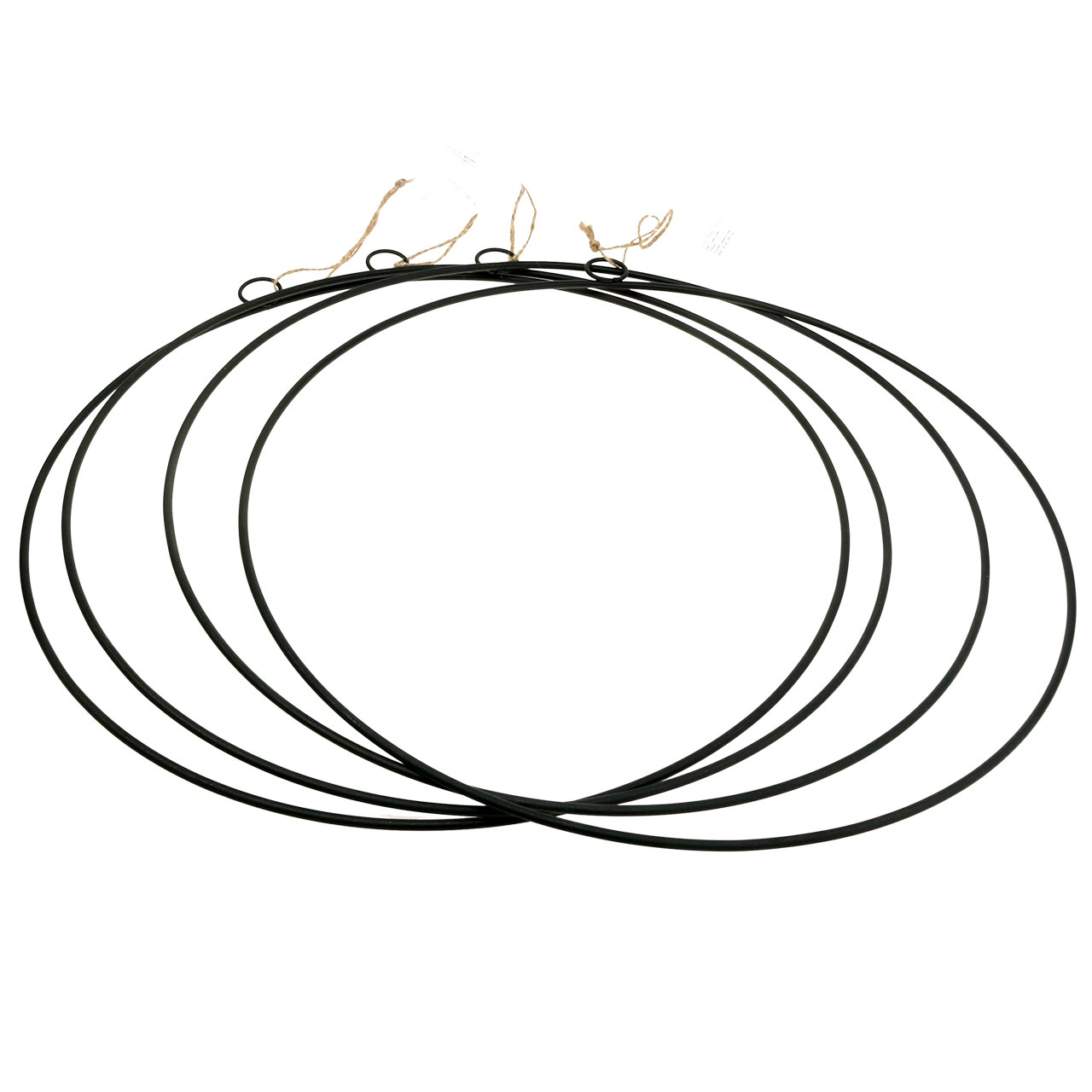 Sie erhalten vier schwarze Dekoringe aus robustem Metall. Jeder davon hat einen Durchmesser von ungefähr 35 Zentimetern, ist rund 4 Millimeter dick und mit einem kleineren Ring sowie einem Juteband zum Aufhängen versehen.