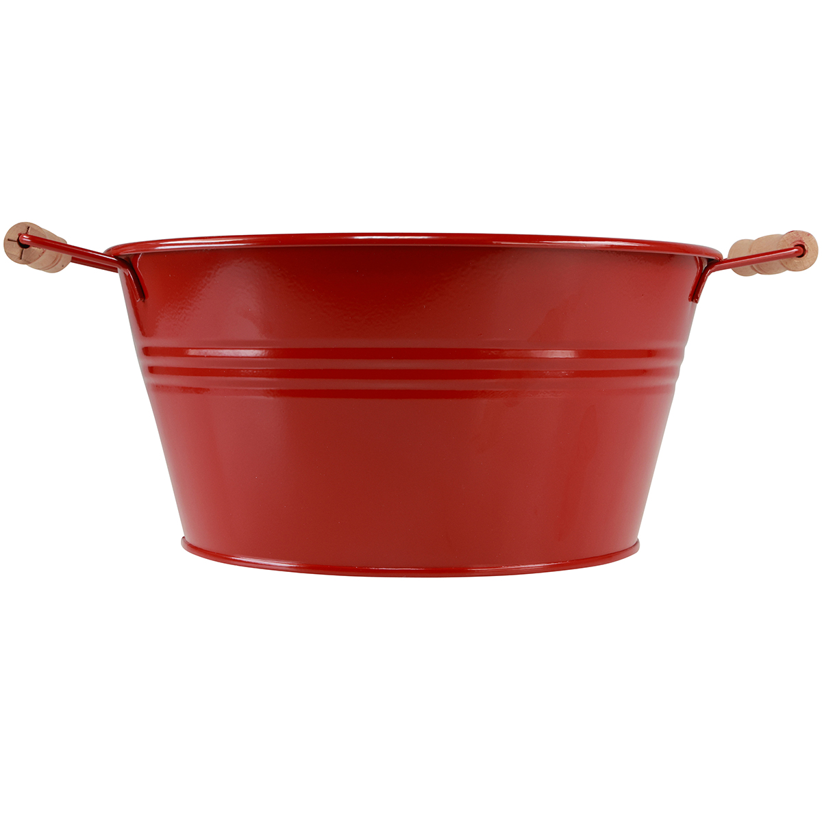 Im schönsten Rot leuchtet diese Blumenschale. Die klassische Form wird von den Henkeln mit echten Holzgriffen perfektioniert. So wirkt die Metall-Deko stimmig und nostalgisch.