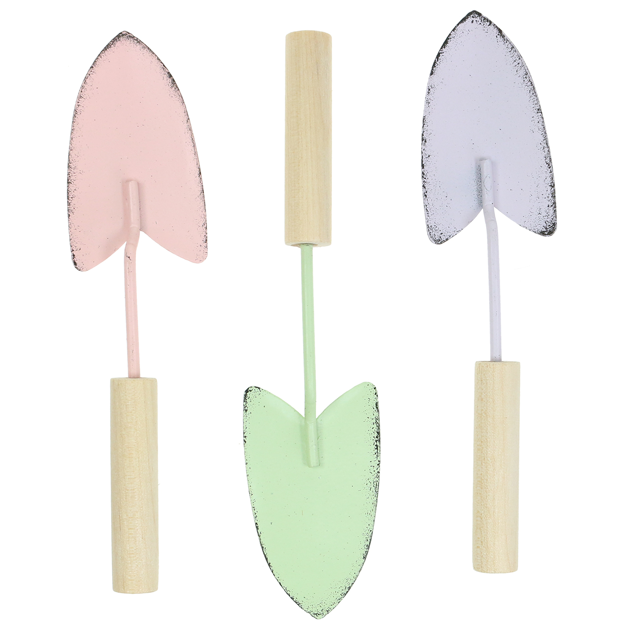 Die bunt sortierten Deko Schaufeln bestehen aus Metall mit einem Griff aus Holz. Sie haben eine Größe von etwa 14 Zentimetern und sind im Set zu 9 Stück erhältlich. Darin sind Exemplare in den Farben Grün, Rosa und Lila enthalten.