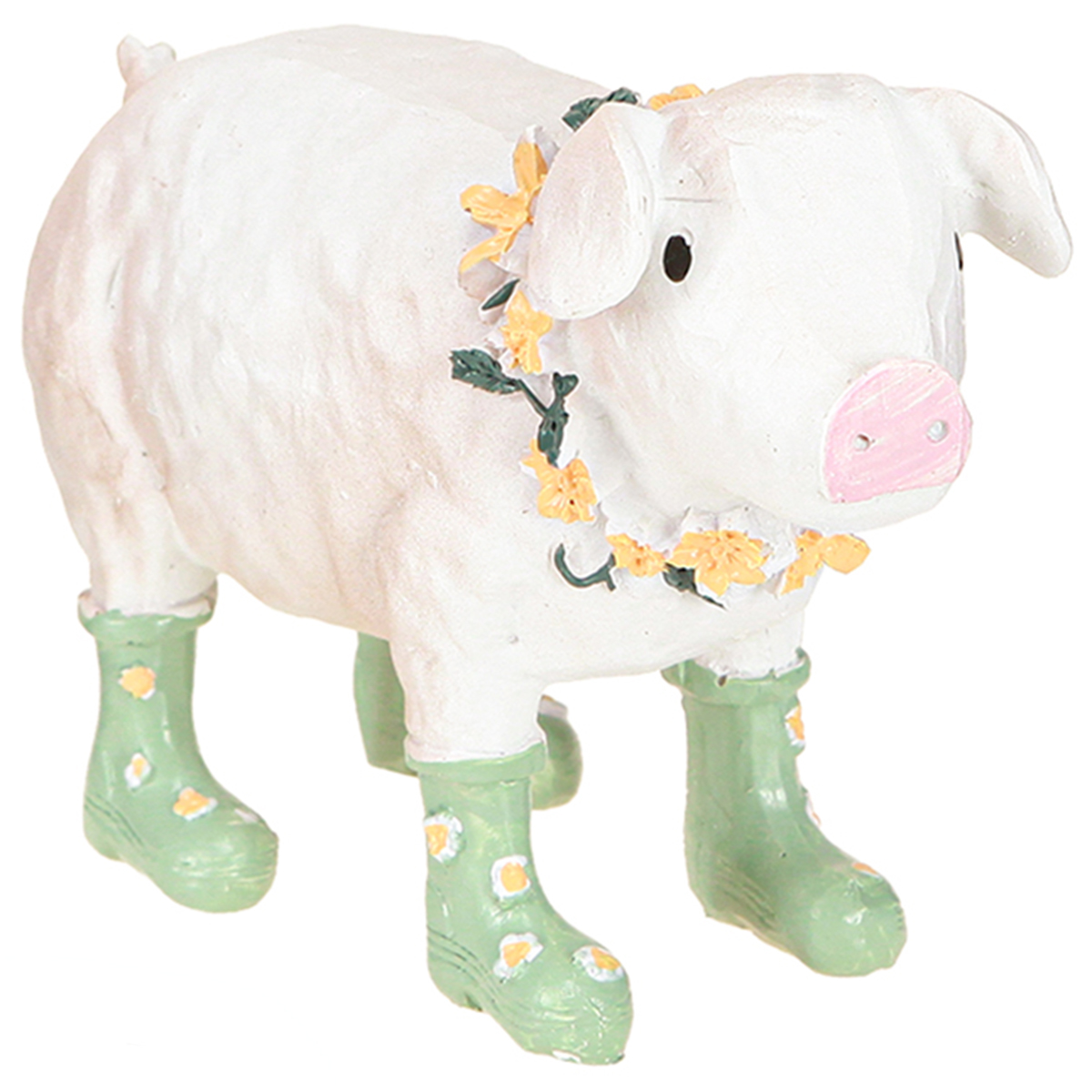 Deko-Schwein mit Gummistiefeln – Lustige Bauernhof-Figur mit Blumenkranz 15,5cm 2 St