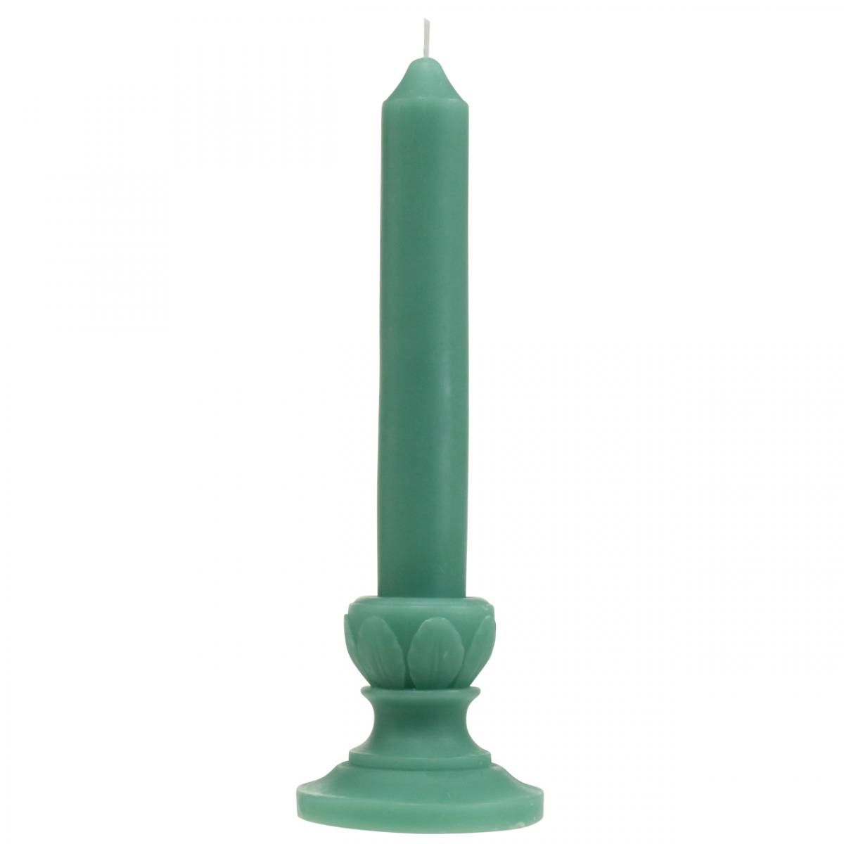 Diese attraktive Deko-Stabkerze beinhaltet ihren eigenen Retro-Kerzenhalter aus Wachs. Die grüne Wachskerze ist vollständig durchgefärbt und in einer originellen, nostalgischen Form mit Ornamenten und Fuß gegossen. So steht die Kerze selbstständig auf dem Tisch und sieht zugleich ausgefallen und ganz klassisch aus. Auf eine gegen Wachsflecken und Wärme unempfindliche Unterlage wie einen flachen Kerzenteller sollten Sie trotzdem achten.Die Dekokerze ist optimal für grüne Tischdeko auf der weißen Tischdecke oder als Nostalgie-Deko auf der Fensterbank. Ein Deko-Tablett bringt die Stabkerze ebenfalls bestens zur Geltung. Dafür lassen sich sowohl eine als auch mehrere Nostalgie-Kerzen verwenden. Doch auch beim Candle-Light-Dinner bietet die Tischkerze einen originellen Hingucker. Vielleicht möchten Sie die Deko-Stabkerze im Retro-Look dafür sogar mit den Nostalgie-Varianten in Lachs oder Rosa kombinieren?