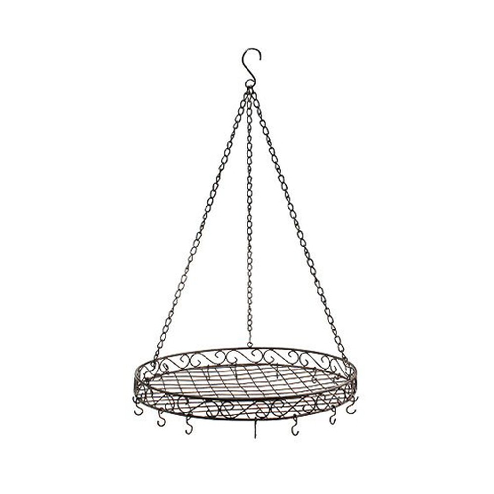 Möchten Sie Ihre Wohnung im schicken Landhaus Stil einrichten und benötigen noch eine tolle Dekorationsidee für Ihre Decke? Dann ist dieses Deko-Tablett genau die richtige Wahl! Der Boden des Tabletts besteht aus einer Gittermasche, die an einem runden Metallring mit klassischen Schnörkeln befestigt ist. An dem Ring sind insgesamt 12 kleine Haken befestigt, an denen Sie zum Beispiel eine Hängepflanze, eine Lichterkette, Kochgeschirr, Messer, Kochlöffel und ein Zwiebelsäckchen hängen können.Aufgehängt wird das Tablett dann mit einem großen Haken, der mit 3 Ketten ebenfalls an dem Ring befestigt wird. Das braune Metall der Landhaus Dekoration wurde obendrein mit ein paar Sprenkeln hellbrauner Farbe bemalt, sodass bewusst ein Abnutzungseffekt erzielt wird. Dieser künstliche Alterungsvorgang wird von Designer auch Vintage Look oder Shabby Chic genannt.