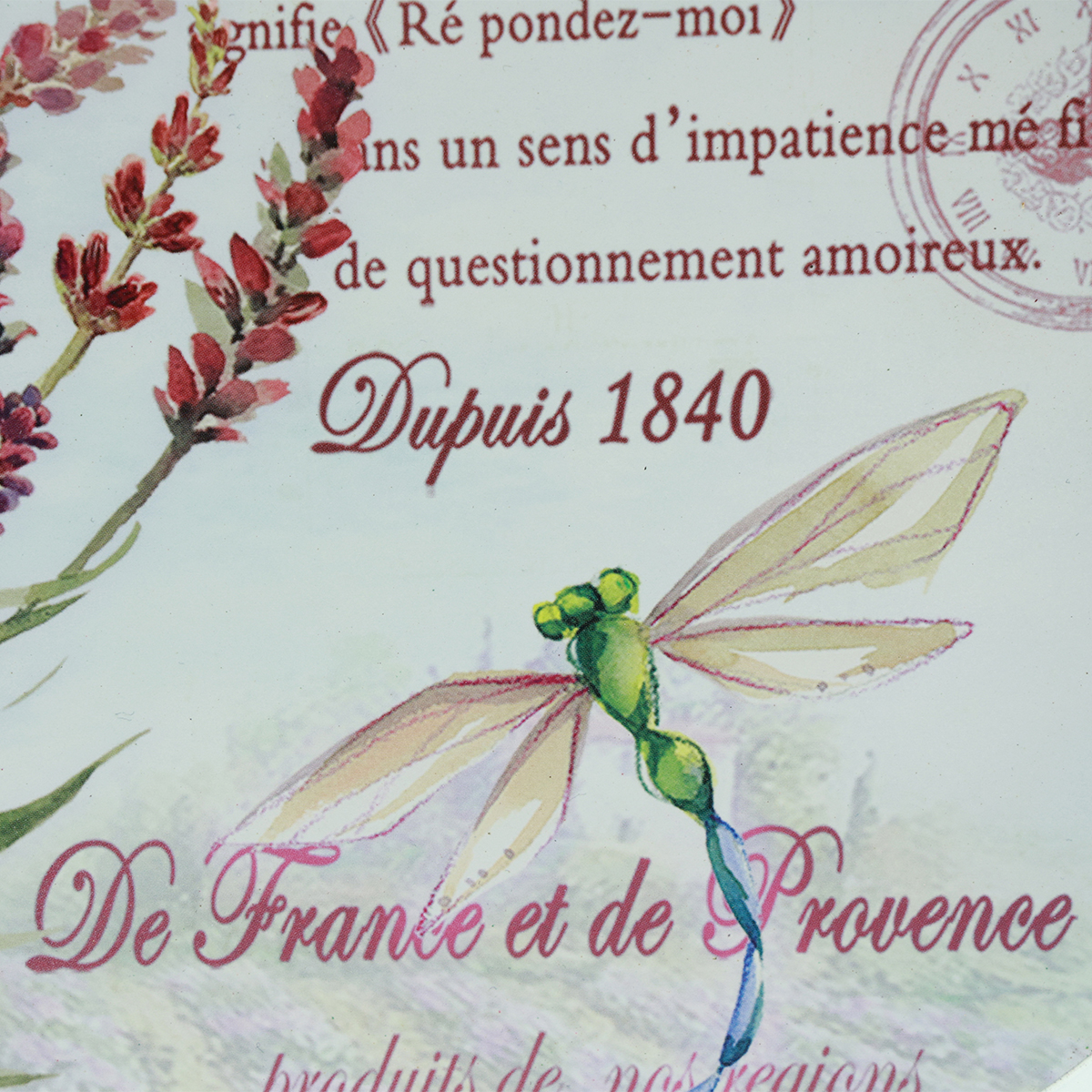 Obwohl das Tablett aus Plastik besteht, wirkt es doch ganz wie ein Holztablett. Der Print mit der provenzalischen Lavendel-Landschaft verleiht der Tischdeko Nostalgie, während die ovale Form und die in den Rand integrierten Griffe dezent modern wirken.
