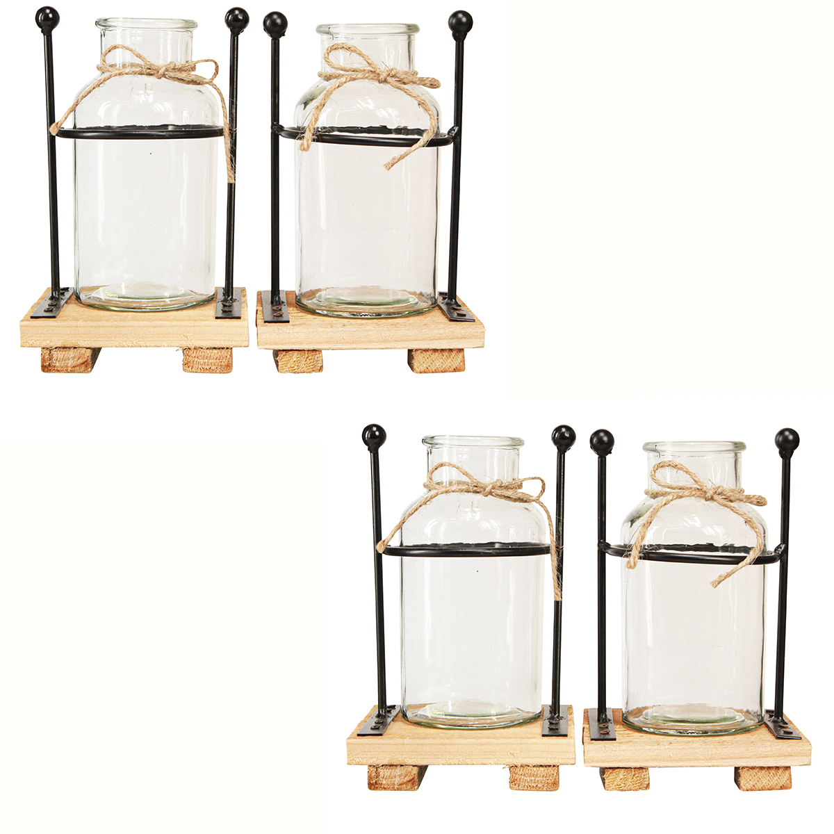 Die Deko-Vasen aus Glas auf Sockel sind ein wahres Highlight in jedem Raum und verleihen sowohl Wohn- als auch Arbeitsbereichen eine stilvolle Ergänzung. Die vier einzigartigen Flaschenvasen kombinieren das klassische Design einer Glasvase mit einem rustikalen Sockel aus individuell bearbeitetem Holz. Die dunklen Metallhalterungen und die mit Jute umwickelten Flaschenhälse betonen den Vintage- und maritimen Stil, während sie gleichzeitig eine natürliche und warme Atmosphäre schaffen.