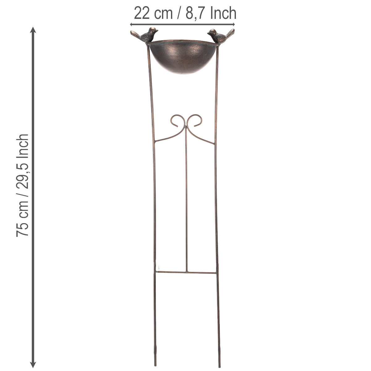 Dieses Vogelbad vereint Funktionalität und Design auf stilvolle Weise. Mit einer Höhe von 75 Zentimeter, einem Durchmesser von 22 Zentimeter und harmonischen Verzierungen im Nostalgie-Look fügt sich dieses Deko-Element wunderbar in Ihre Gartenlandschaft ein. Die liebevoll gestalteten kleinen Metallvögel an den Seiten der Schale und das kunstvolle Rankenornament unterstreichen den Vintage-Charakter und verleihen Ihrem Garten eine märchenhafte Note. Nutzen Sie das Vogelbad als praktische Tränke für Vögel oder als Blumenschale für Ihre kreativsten Ideen. Besonders in den wärmeren Monaten können Sie farbenfrohe Blumen, dekorative Steine oder Schwimmpflanzen arrangieren, um einen einzigartigen Gartenakzent zu setzen. Dank der Rankhilfe eignet sich dieses Accessoire zudem ideal, um Kletterpflanzen wie Clematis oder Efeu elegant in Szene zu setzen. Die hochwertige Verarbeitung aus Metall in edler Bronze-Optik macht das Vogelbad bedingt wetterresistent und verleiht ihm auch eine besonders edle Ausstrahlung. Die Reinigung ist denkbar einfach: Spülen Sie die Schale mit klarem Wasser aus, um den Glanz über die Jahre zu erhalten.
